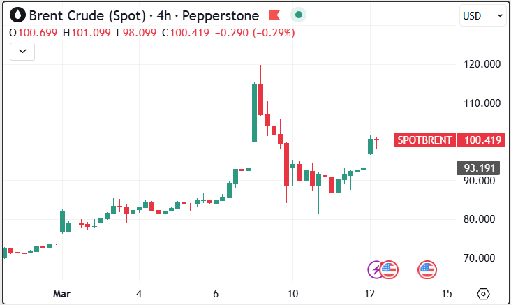 الأمر هذه المرة يبدو مختلف من ناحية السلوك السعري فقد سجل التقلب الأسبوعي على النفط أعلى مستوى تاريخي له منذ مطلع الثمانينيات. شهدنا تحركات عنيفة تمثلت في صعود بـ 20% ، يليه صعود آخر مماثل ، ثم ضغوط بيعية حادة ، لتعود الأسعار الآن إلى مستوى 100 دولار للبرميل ، مما يعكس حالة من عدم اليقين المطلق وتسعير يتبع العناوين الإخبارية.