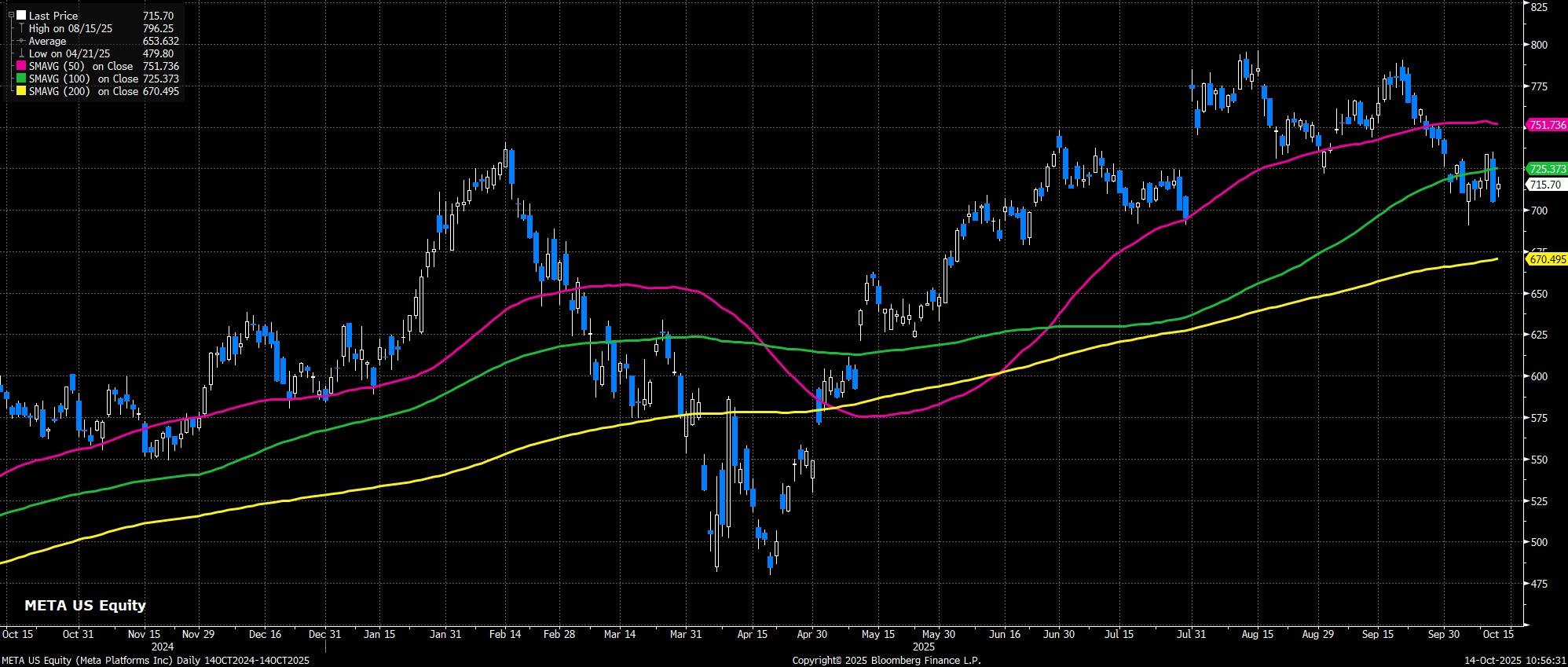 ارتفع سهم ميتا بأكثر من 22% خلال عام 2025، وهو أداء يوازي تقريبًا أداء قطاع خدمات الاتصالات، مع تفوق واضح على أداء مؤشر S&P 500 القياسي. ومن حيث الأوزان في المؤشرات، تحتل ميتا المرتبة الخامسة بين أكبر الشركات في كلٍّ من S&P 500 وNasdaq 100، بأوزان تبلغ 2.9% و5.5% على التوالي.