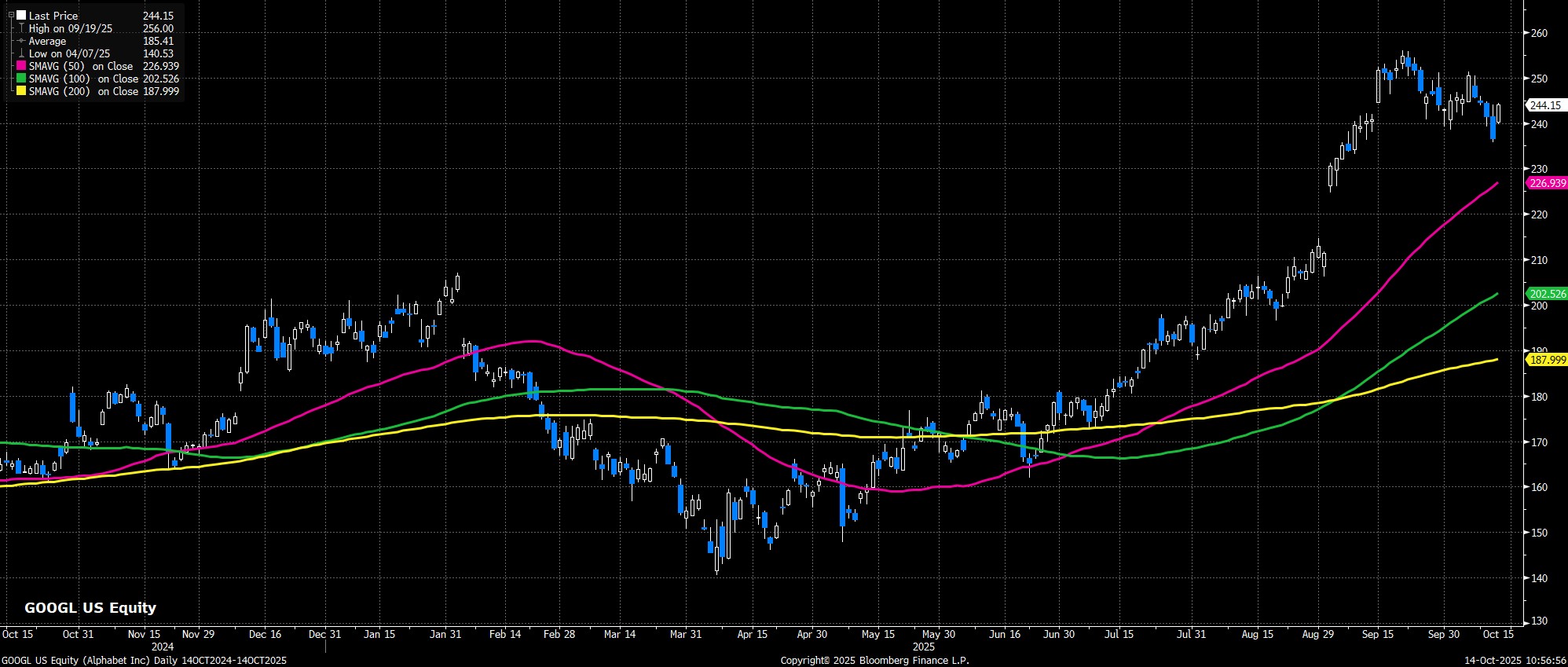 قدّمت شركة ألفابت ثاني أفضل أداء بين مجموعة «السبعة العظام» هذا العام، متفوَّقة عليها فقط إنفيديا، إذ حققت مكاسب قوية بلغت 28% منذ بداية العام، متجاوزةً بسهولة مكاسب مؤشر S&P 500 القياسي. وعند الجمع بين الفئتين من أسهم الشركة، فإنها تشكّل وزنًا نسبيًا يبلغ 4.9% في مؤشر S&P 500، ونسبة أكبر تصل إلى 9.1% في مؤشر Nasdaq 100 الذي يهيمن عليه قطاع التكنولوجيا.
