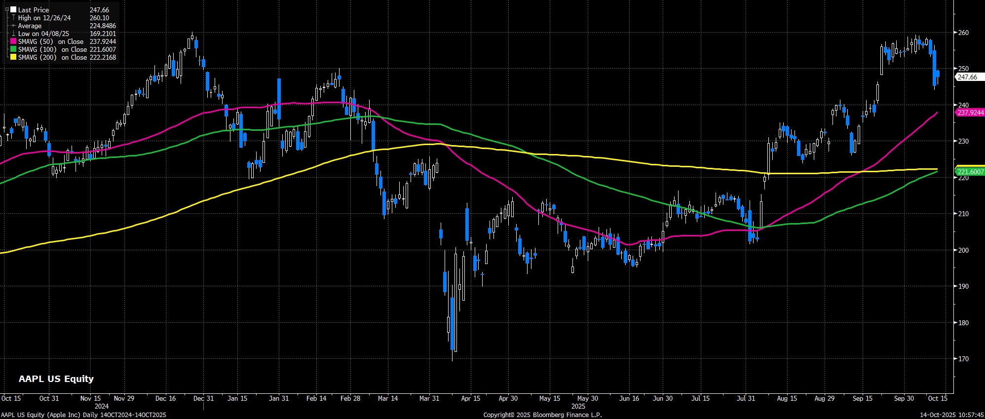 رغم النجاح الكبير الذي حققه إطلاق iPhone 17، لا تزال آبل تعاني من بطء التقدم في مجال الذكاء الاصطناعي، وهو ما يفسر إلى حدٍّ كبير سبب تداول السهم دون تغيير يُذكر منذ بداية العام، بعد أن أمضى معظم الأشهر السابقة في المنطقة السلبية. ومع ذلك، تظل الشركة ثالث أكبر مكوّن من حيث الوزن في كلٍّ من مؤشر S&P 500 وNasdaq 100، كما أنها من مكونات مؤشر داو جونز أيضًا.