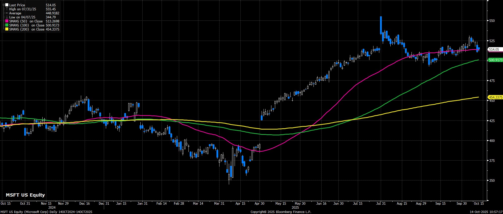قدّمت مايكروسوفت أداءً قويًا منذ بداية العام، إذ ارتفع سهمها بنحو 20%، متفوقًا على كلٍّ من مؤشر S&P 500 وقطاع تكنولوجيا المعلومات، حتى وإن فقد السهم جزءًا من مكاسبه منذ الصيف. ومع ذلك، تبقى مايكروسوفت ثاني أكبر شركة من حيث الوزن في كلٍّ من مؤشري S&P 500 وNasdaq 100، وتشكل نسبة ضخمة تبلغ 11.8% من الأخير، كما أنها ثاني أكبر مكوّن في مؤشر Dow Jones.