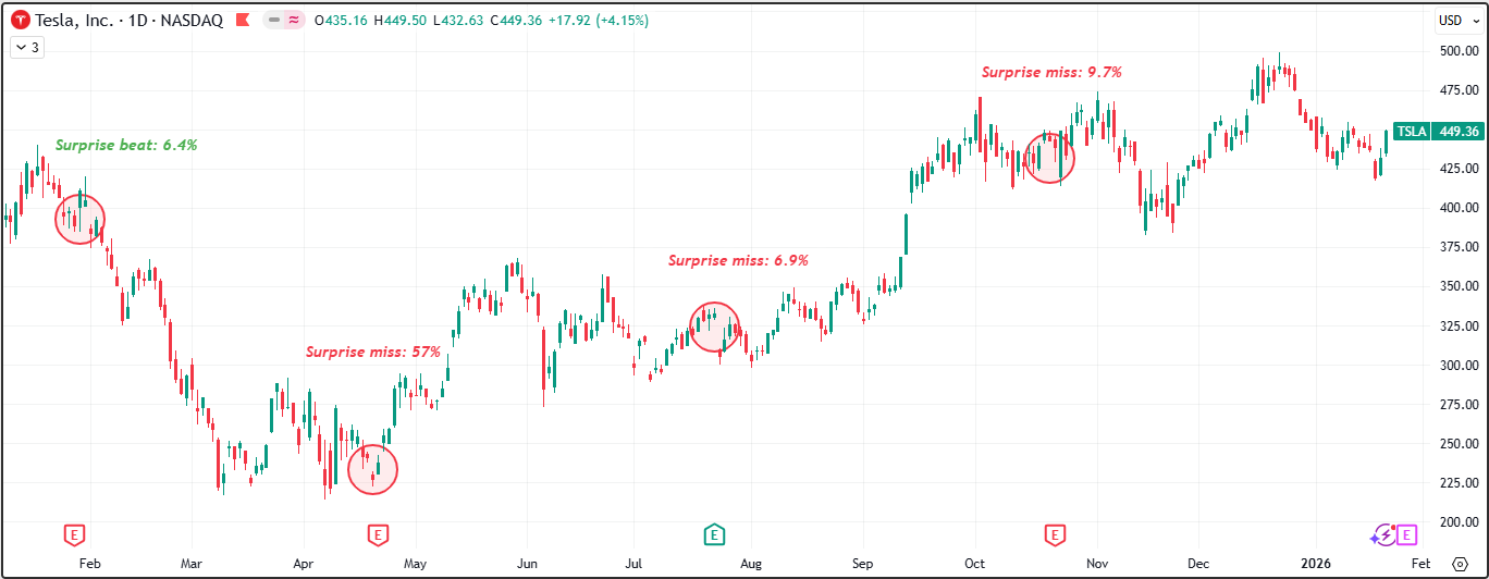 الأرباع الأربعة الماضية تقدم مثال واضح على أن مفاجآت الأرباح وحدها لم تعد كافية لتفسير حركة سهم تسلا. في الربع المنتهي في ديسمبر 2024 ، سجلت الشركة مفاجأة إيجابية محدودة ، إلا أن تفاعل السهم كان خافت نسبياً ، إذ طغت مخاوف تسعير السيارات الكهربائية وتآكل الهوامش على إشارات إيجابية قصيرة الأجل.