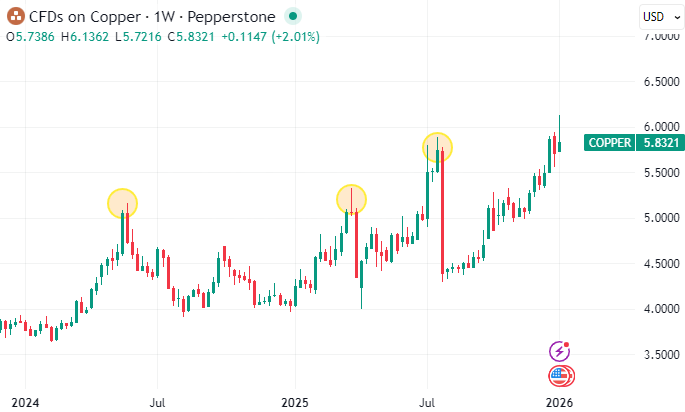 أما النحاس فيتأثر بقوة من زاوية الإضرابات والاضطرابات العمالية ، خصوصاً أن إنتاجه متركز في دول مثل تشيلي وبيرو ، حيث يمكن للإضرابات أو التشديد البيئي أو مشاكل التراخيص أن تخفض المعروض في وقت تكون فيه المخزونات العالمية حساسة للمعدن ككل. ومع النحاس تحديداً ، ارقام المخزونات الاسبوعية مقياس للضيق فحين تنخفض المخزونات ، يصبح السوق سريع الاشتعال ، والاخبار السلبية على العرض تنعكس بشكل كبير.
