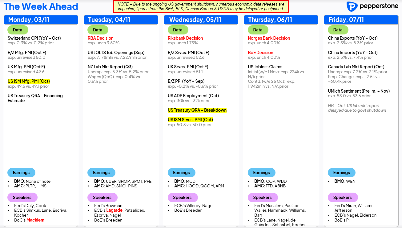على صعيد الطاقة، أعلنت أوبك+ زيادة إضافية في الإنتاج بنحو 137 ألف برميل يومياً لشهر ديسمبر، وهو ما كان متوقع على نطاق واسع ، إلا أن المجموعة أشارت إلى أن زيادات الإنتاج ستتوقف بين يناير ومارس. أما في الولايات المتحدة ، فما زال الإغلاق الحكومي مستمر، ومن المرجح أن الأسواق لن تحصل على تقرير الوظائف غير الزراعية هذا الشهر، ما سيدفع المتداولين إلى مراقبة بيانات بديلة عن سوق العمل لتقييم المخاطر.