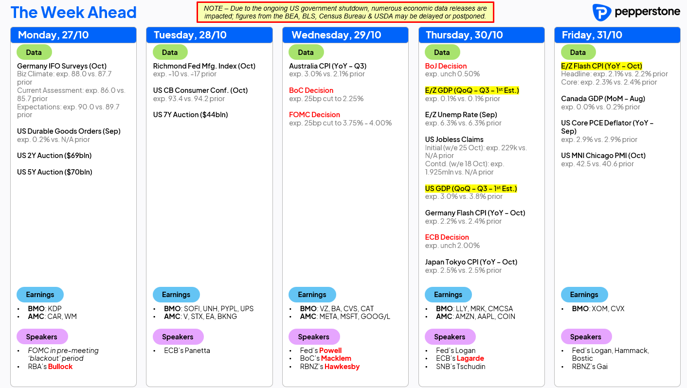 يشهد هذا الأسبوع واحداً من أكثر جداول الأحداث ازدحاماً في العام، حيث تتقاطع السياسات الاقتصادية الكبرى مع نتائج شركات التكنولوجيا العملاقة والمخاطر السياسية في مشهد واحد غني بالتقلبات المحتملة. ينبغي على المتداولين الانتباه إلى ما يلي: