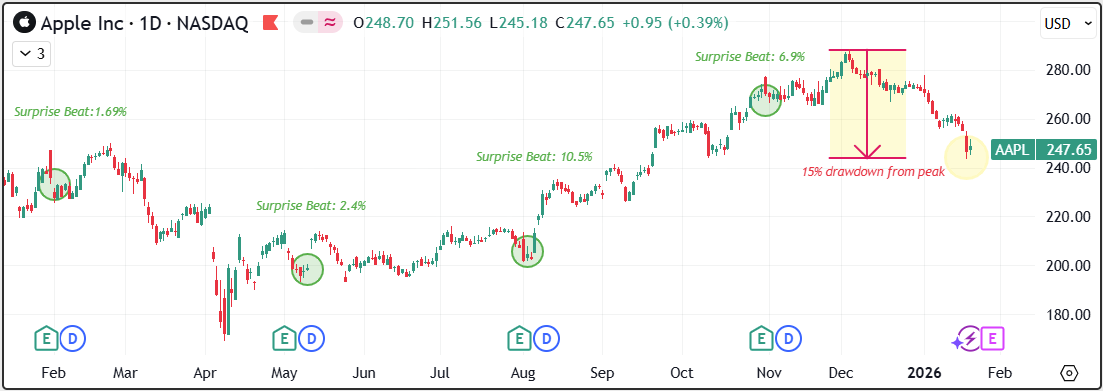 خلال الأرباع الأربعة الماضية ، أثبتت آبل قدرتها على تحقيق أرباح تفوق توقعات السوق بشكل متكرر. آخر إعلان للأرباح أظهر تسجيل ربحية سهم بلغت 1.85 دولار مقابل توقعات عند 1.73 دولار، وهو مفاجأة إيجابية تقارب 7%. وفي الربع الذي سبقه ، كانت المفاجأة أكثر وضوح متجاوزة حاجز 10%. هذه النتائج عززت ثقة المستثمرين في كفاءة آبل في التفوق على التوقعات في ظل البيئة التجارية المتقلبة العام الماضي ، لكنها في المقابل رفعت سقف التوقعات بشكل جعل السوق أقل تسامح مع تباطؤ النمو او احتمال تزايد التكاليف وانكماش الهوامش.