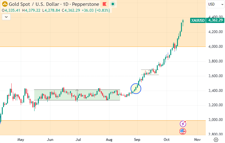 في أسواق السلع خطف الذهب الأضواء مجدداً بعد أن سجل مستوى أعلى من 4350 دولار للأونصة متجاوز قممه السابقة وسط تدفقات شرائية قوية من المستثمرين الأفراد والمؤسسات على حد سواء منذ بداية سبتمبر مدفوع بمزيج من ضعف الدولار وتزايد الرغبة في التحوط ضد المخاطر السياسية والتضخمية. اللافت أن الارتفاع الأخير جاء رغم غياب محفز فوري واضح ما يدل على أن الاتجاه أصبح ذاتي الدفع بفعل الزخم حيث تتحول كل عملية تصحيح قصيرة إلى فرصة شراء جديدة