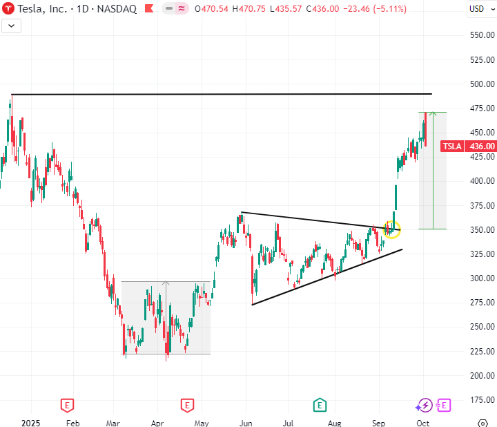 من الناحية الفنية ، يظهر الرسم البياني أن سهم تسلا اخترق نموذج المثلث الصاعد بقوة، ليقفز من مستويات 350 دولار إلى قرابة 470 دولار في فترة قصيرة للغاية. هذا الارتفاع السريع يعكس شهية قوية من المستثمرين وإقبال واسع على أسهم الشركة، مدفوعا بالتوقعات العالية. لكن الأسواق بطبيعتها لا تسير في خط مستقيم ، فجاءت جلسة الأمس لتشهد تراجعاً حاداً تجاوز 5% إلى مستوى 436 دولار. هذا التراجع يعكس ما يعرف في الأسواق بظاهرة بيع الخبر ، حيث يقوم المستثمرون بجني الأرباح بعد موجة صعود قوية.
