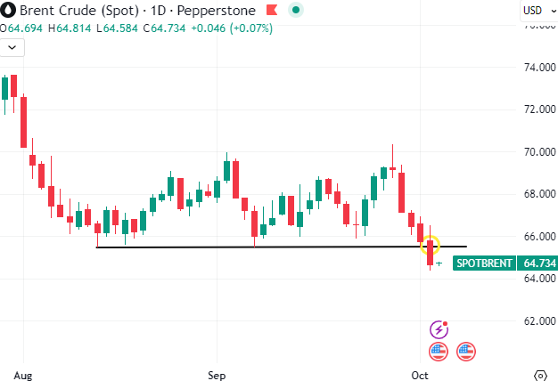 في موازاة ذلك، تتجه الأنظار في نهاية هذا الاسبوع هذا الأسبوع إلى اجتماع أوبك+ الذي قد يحمل في طياته تطورات مهمة لسوق الطاقة. التوقعات تشير إلى احتمال إعلان التحالف عن زيادة اكبر من المتوقع سابقا في الإنتاج، في محاولة لموازنة السوق بين دعم الأسعار ومراعاة المخاطر التي يفرضها التباطؤ الاقتصادي العالمي. هذه خطوة تشكل ضغطاً إضافياً على أسعار النفط ، خاصة في ظل ضعف الطلب من الصين . الرسم البياني لخام برنت يعكس هذه الضغوط بوضوح ، حيث يتداول السعر حالياً عند 64.7 دولار بعد أن كسر مستوى دعم رئيسياً قرب 65 دولار. هذا الاختراق يعكس أن موجة البيع تزداد قوة ، وأن الإعلان عن زيادة الإنتاج قد يدفع الأسعار إلى مستويات أدنى في الأجل القريب، ما يجعل الموقف حساس بالنسبة للمنتجين ولكن اعتقد ان التوجه العام هو المحافظة والاستحواذ على حصه سوقية اكبر.