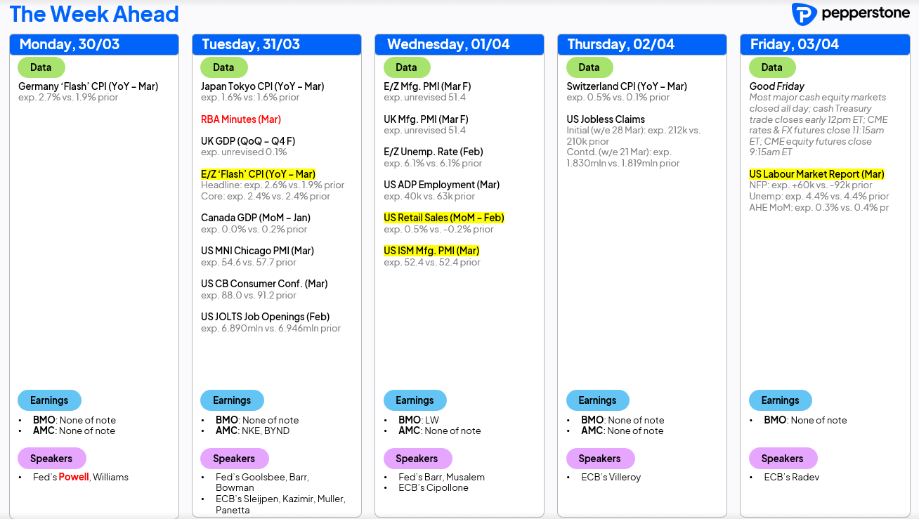 بالتالي ، يتحول التركيز إلى البيانات التي تعكس ظروف مارس وما بعده. سيكون مؤشر مديري المشتريات الصناعي الأمريكي (ISM)، لا سيما مكون الأسعار المدفوعة، عنصر محوري. كما يُتوقع أن يرتفع التضخم في أوروبا من 1.9% إلى 2.6% ، في حين سيظل تقرير الوظائف الأمريكي (Payrolls) تحت المجهر. أصبحت الأسواق أكثر حساسية للمفاجآت السلبية ، خاصة إذا اتجه معدل البطالة نحو 4.5% أو أعلى. كما ستلعب بيانات فرص العمل (JOLTS) ومطالبات البطالة الأسبوعية دور مهم في تشكيل السردية الاقتصادية.