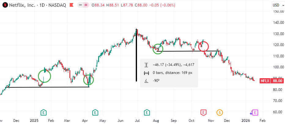إعلان أرباح الربع الرابع اكثر من رقم ربحية وانما ابعد من ذلك وهو ما يشكل اختبار لرؤية نتفليكس الاستثمارية والتشغيلية. السوق سيبحث عن إشارات على استقرار او المحافظة على نسب النمو ، وانضباط التكاليف ، ورؤية استراتيجية متماسكة للمرحلة المقبلة للاستحواذ المحتمل. في حال جاءت النتائج والتوجيهات أفضل من المتوقع ، قد نكون أمام نقطة انعطاف للسهم بعد أشهر من الضغط افقد السهم نحو ثلث قيمته من القمة المسجلة. تشير التوقعات الى تحرك في السهم يقدر بنحو 7% بعد إعلان النتائج بعد جلسة التداول يوم 20 يناير.
