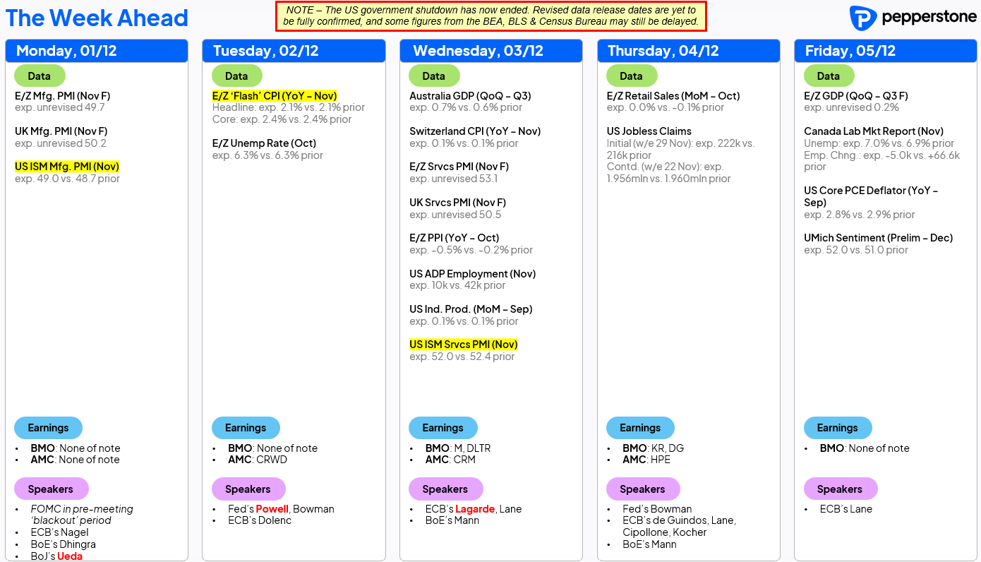 تقارير ISM للقطاعين الخدمي والتصنيعي قد تولّد موجات متفرقة من التقلب ، وكذلك بيانات الدخل والإنفاق الشخصي. عاد مؤشر تسريحات الوظائف لشركة Challenger إلى دائرة اهتمام المتداولين بعدما أظهرت بيانات أكتوبر قفزة قوية بلغت 175% في عمليات التسريح. أي ارتفاع كبير جديد في بيانات نوفمبر سيعزز توقعات خفض الفائدة بمقدار 25 نقطة أساس في 10 ديسمبر.