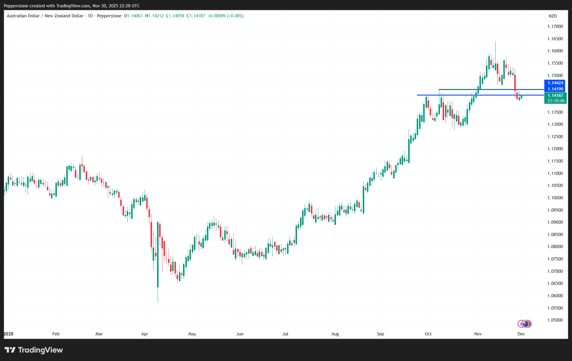 مراقبة AUDNZD لاحتمال كسر مستوى 1.1400 نزولاً ، مع استهداف محتمل عند 1.1300 إذا تحقق الكسر.