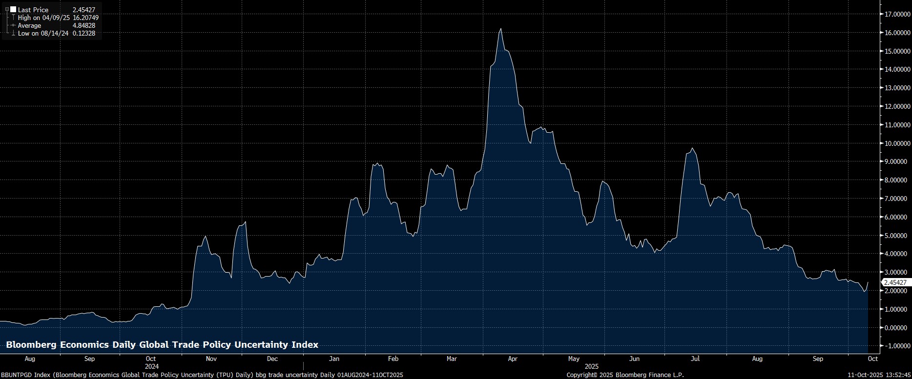 في البداية ، بدا الأسبوع الماضي وكأنه أحد تلك الأسابيع التي تفتقر إلى محور واضح، إذ تذبذبت الأسواق دون اتجاه محدد نتيجة استمرار غياب البيانات الأمريكية بسبب إغلاق الحكومة. لكن كل ذلك تغيّر بشكل مفاجئ في أواخر يوم الجمعة، عندما نشر الرئيس ترامب رسالة مفاجئة على منصة تروث سوشال أعادت فجأة مخاطر الحرب التجارية إلى الواجهة وبقوة غير مرحب بها.