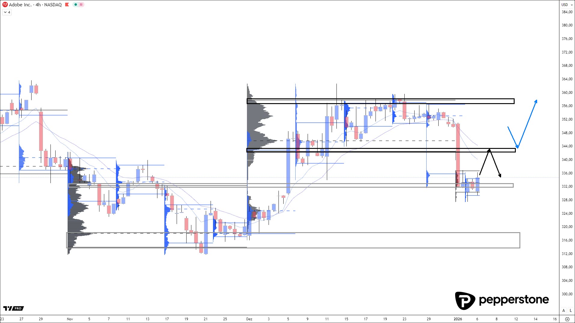 Im Dezember hatte sich bei Adobe eine saubere Seitwärtsphase etabliert, begrenzt durch die Value Area zwischen grob 343/344 und 356 US-Dollar. Diese Zone definierte den akzeptierten Preisbereich des Marktes. Mit dem dynamischen Bruch unter die Value Area Low wurde diese Akzeptanz jedoch klar aufgekündigt. Ein solcher Bruch ist keine normale Schwankung, sondern ein strukturelles Ereignis: Käufer ziehen sich zurück, während Verkaufsinteresse dominiert. Solange der Markt unter dieser ehemaligen Fair-Value-Zone notiert, bleibt der Bias eindeutig auf der Short-Seite.