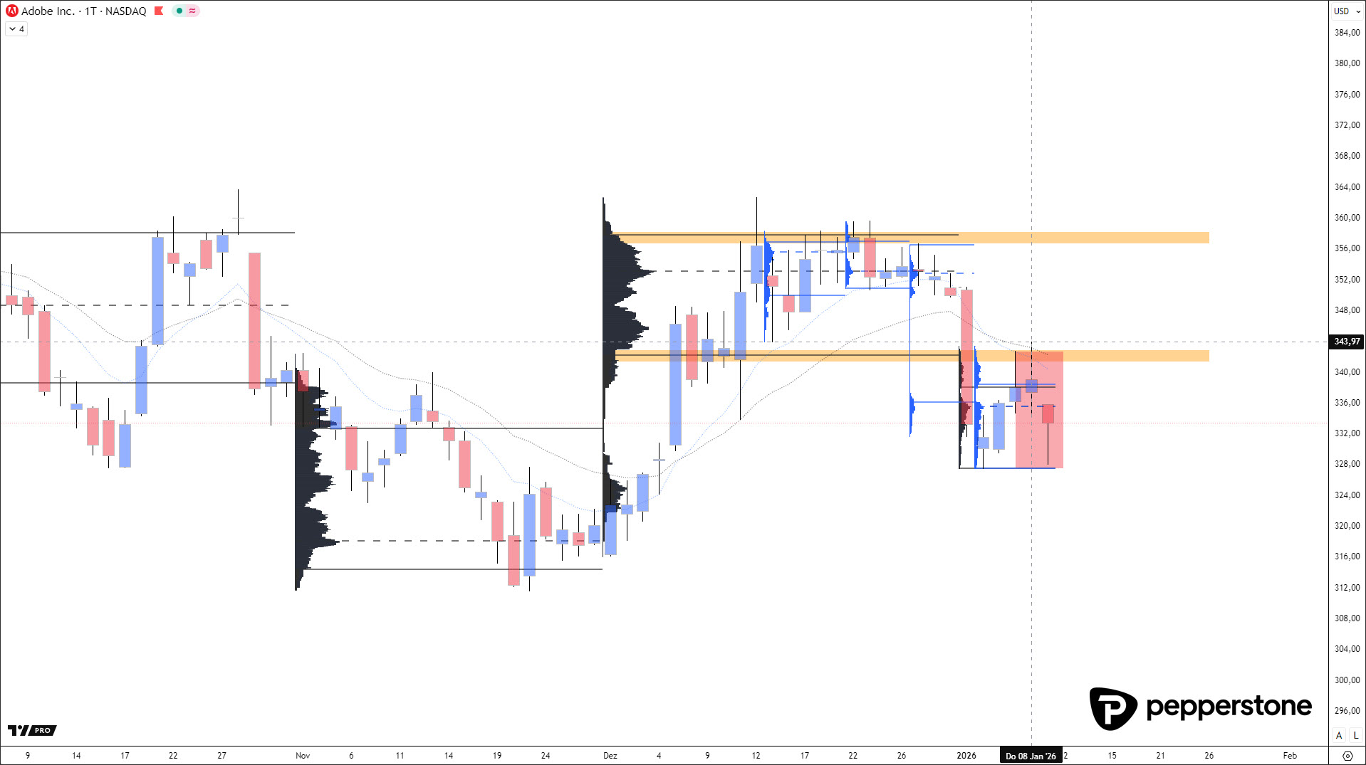 Im Dezember hatte sich bei Adobe eine saubere Seitwärtsphase etabliert, begrenzt durch die Value Area zwischen grob 343/344 und 356 US-Dollar. Diese Zone definierte den akzeptierten Preisbereich des Marktes. Mit dem dynamischen Bruch unter die Value Area Low wurde diese Akzeptanz jedoch klar aufgekündigt. Ein solcher Bruch ist keine normale Schwankung, sondern ein strukturelles Ereignis: Käufer ziehen sich zurück, während Verkaufsinteresse dominiert. Solange der Markt unter dieser ehemaligen Fair-Value-Zone notiert, bleibt der Bias eindeutig auf der Short-Seite.