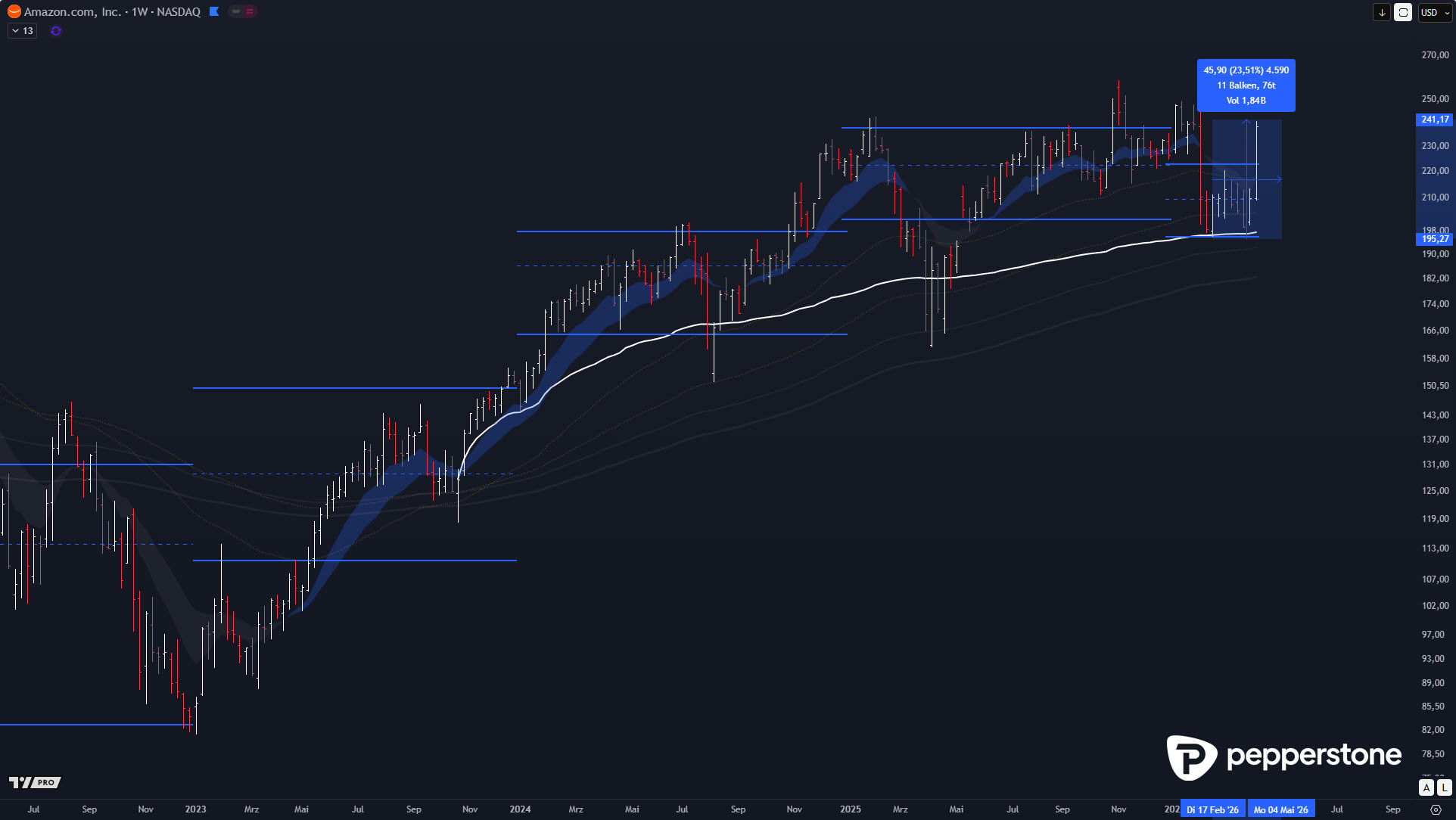 Mit dem Impuls verschiebt sich die Aufgabe nun vom „Support handeln“ hin zum strukturierten Re-Entry-Plan. Sollte es zu Rückläufen kommen, ist vor allem der Bereich 207 bis 210 USD hochrelevant, weil dort ein sinnvoller Einstieg aus einer untergeordneten Korrektur in den übergeordnet laufenden Impuls möglich wird. Genau diese Pullback-Logik ist in starken Trends oft der sauberste Weg, um das Chancen-Risiko-Profil wieder zu normalisieren, statt nach dem Anstieg nur noch teure Breakout-Käufe zu erzwingen.