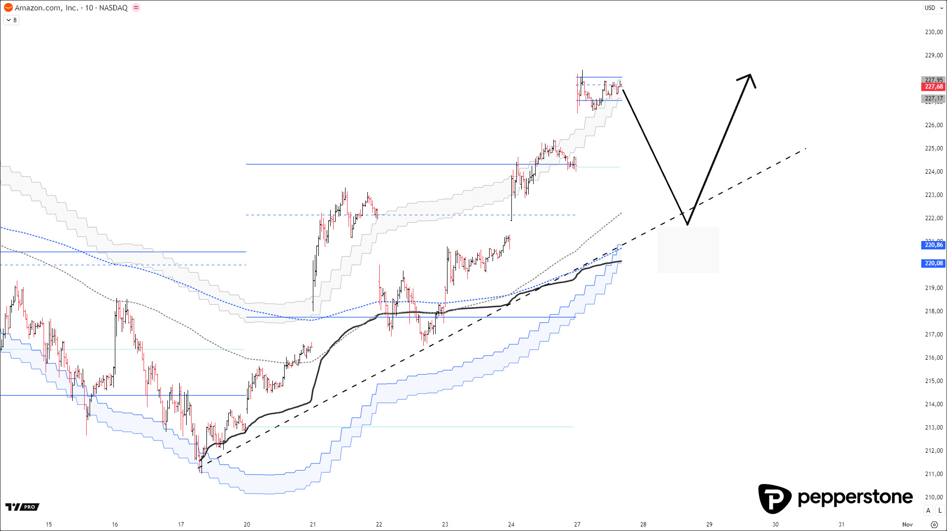 Amazon bleibt ein klar bullischer Titel mit kurzfristigem Korrekturpotenzial. Der nächste interessante Kaufbereich liegt im Umfeld des volumengewichteten Durchschnitts zwischen 216 und 220 USD. Erst eine bestätigte Reaktion in dieser Zone eröffnet ein sauberes Long-Setup. Der aktuelle Kurs ist hoch, die Struktur überdehnt – daher ist selektives Abwarten die professionellere Variante. Wer konsequent arbeitet, plant, statt zu spekulieren, und erkennt: Liquidität, Geduld und Struktur sind die eigentlichen Wettbewerbsvorteile im modernen Handel.