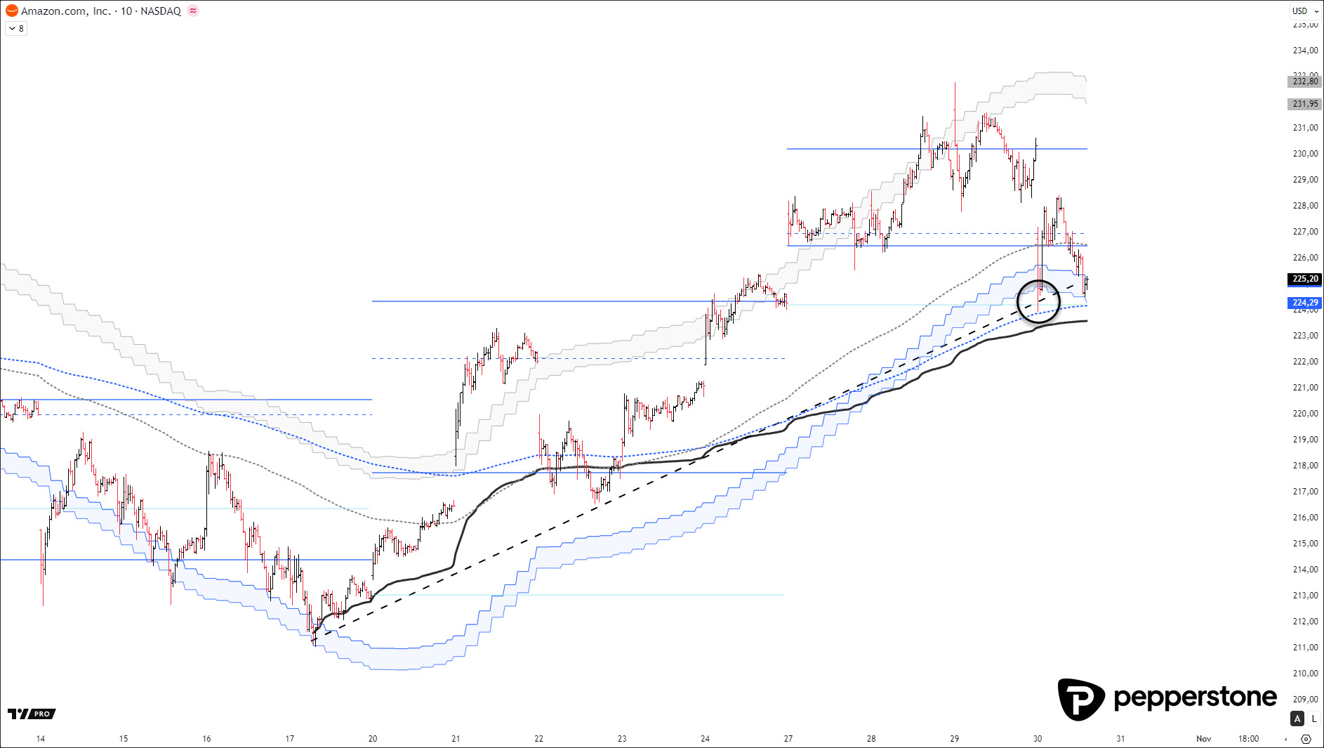 Amazon bleibt ein klar bullischer Titel mit kurzfristigem Korrekturpotenzial. Der nächste interessante Kaufbereich liegt im Umfeld des volumengewichteten Durchschnitts zwischen 216 und 220 USD. Erst eine bestätigte Reaktion in dieser Zone eröffnet ein sauberes Long-Setup. Der aktuelle Kurs ist hoch, die Struktur überdehnt – daher ist selektives Abwarten die professionellere Variante. Wer konsequent arbeitet, plant, statt zu spekulieren, und erkennt: Liquidität, Geduld und Struktur sind die eigentlichen Wettbewerbsvorteile im modernen Handel.