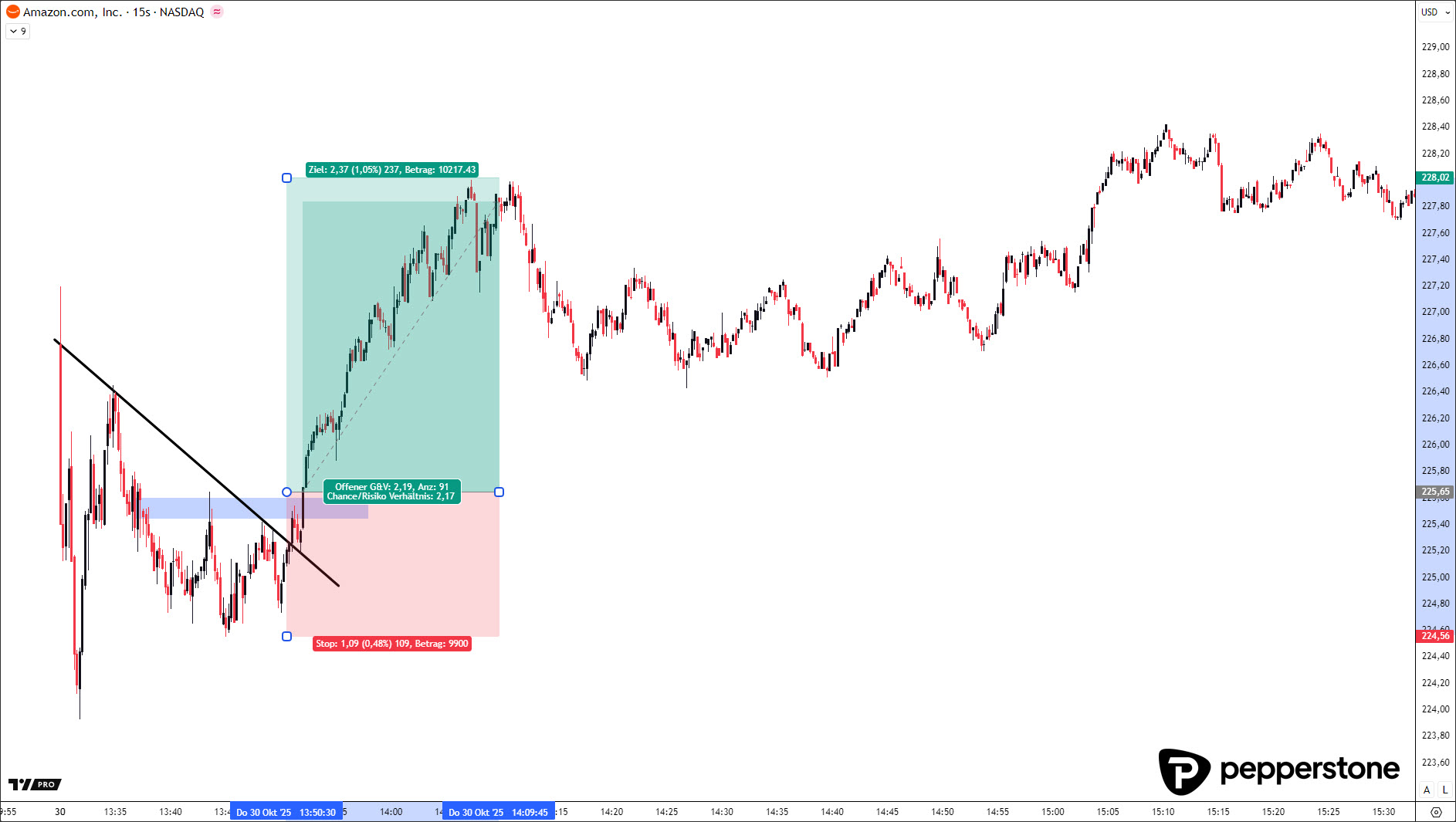 Die zentrale Beobachtungszone liegt zwischen 216 und 220 USD, wo sowohl die neigende Trendlinie als auch der Anchored VWAP verlaufen. In diesem Preisbereich wird der Markt aus taktischer Sicht wieder attraktiv: Hier treffen Marktstruktur, Volumenprofil und institutionelle Preisinteressen aufeinander. Sollte Amazon diese Zone dynamisch ansteuern und dort bullische Reaktionssignale auf Minutenbasis zeigen – etwa Absorptionen oder kurzfristige Trendwechsel – wäre ein Long-Szenario technisch valide. Eine Bestätigung ist essenziell, da der aktuelle Aufwärtstrend zwar intakt, aber überdehnt ist. Ohne Korrektur bleibt die Aktie anfällig für kurzfristige Rücksetzer.