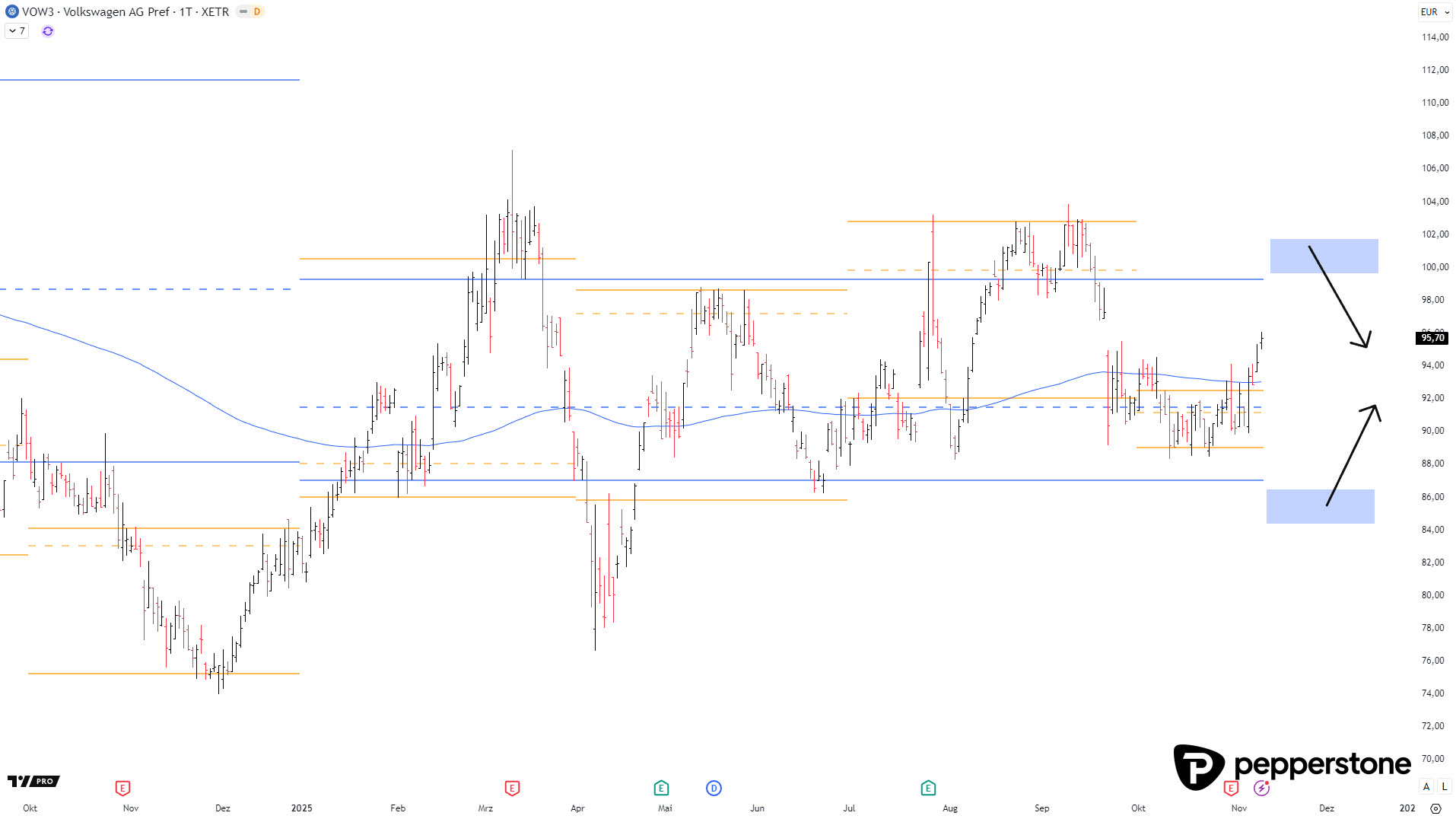 Volkswagen bleibt kurzfristig ein strukturell neutraler Titel mit begrenztem Trendpotenzial, dafür aber mit klar definierbaren Handelszonen. Entscheidend ist, Seitwärtsphasen nicht als unhandbar zu betrachten, sondern als strukturiertes Spielfeld, in dem sich kontextbewusste Händler gezielt positionieren können.