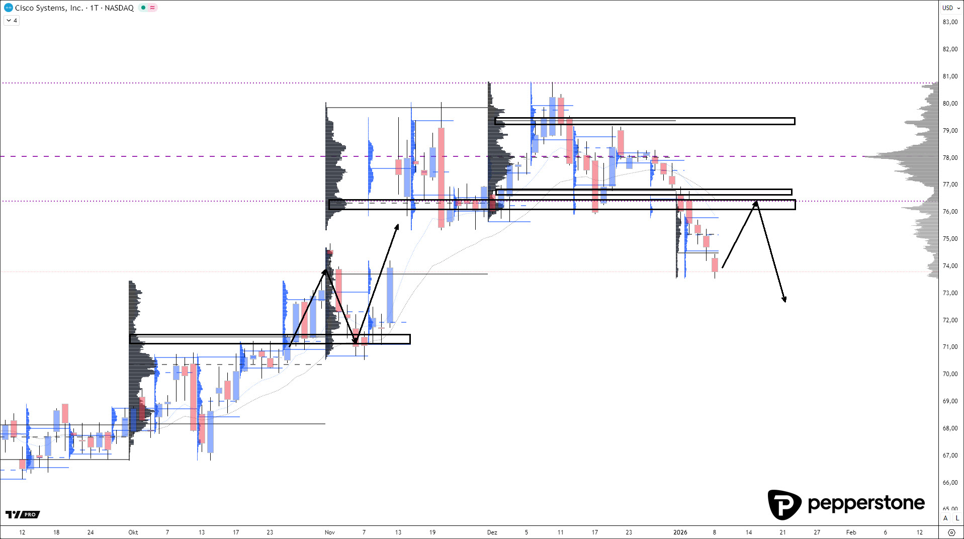 Das professionelle Szenario entsteht nicht im Ausbruch selbst, sondern im Rücklauf. Nach längeren Seitwärtsphasen ist es typisch, dass gebrochene Value-Zonen erneut getestet werden. Sollte Cisco in den Bereich der ehemaligen Value Area Low zurücklaufen – grob um 76 US-Dollar – wird diese Zone zur entscheidenden Schaltstelle. Relevant wird sie jedoch nur dann, wenn sich dort untergeordnet Schwäche zeigt. Absorption steigender Kurse oder ein klarer untergeordneter Strukturbruch sind notwendig, um das Risiko eines steigenden Messers auszuschließen und den Retest sauber zu handeln.