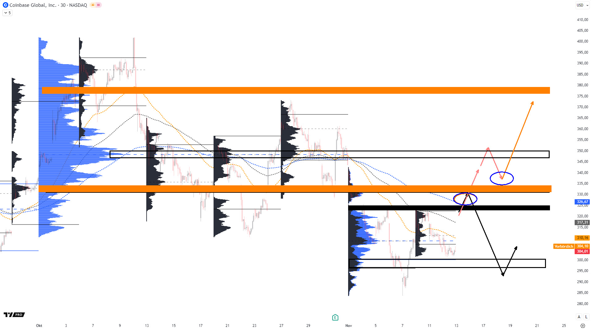 Sollte Coinbase hingegen mit Momentum über die obere Value-Grenze hinauslaufen und die Widerstandscluster ohne erkennbare Schwäche durchbrechen, wäre ein Pullback-Long-Szenario das Alternativszenario. In diesem Fall wäre ein Rücklauf in den Bereich um 335 USD, also an den Rand der alten Seitwärtsstruktur, die strategische Long-Marke. Der Markt würde damit in seine ehemalige Distributionsphase zurückkehren – ein typisches Muster nach einer dynamischen Trendwende. Auch hier gilt: Die Preisreaktion entscheidet. Nur wenn das Momentum bestätigt und das Volumen stabil bleibt, entsteht eine echte Re-Entry-Gelegenheit.