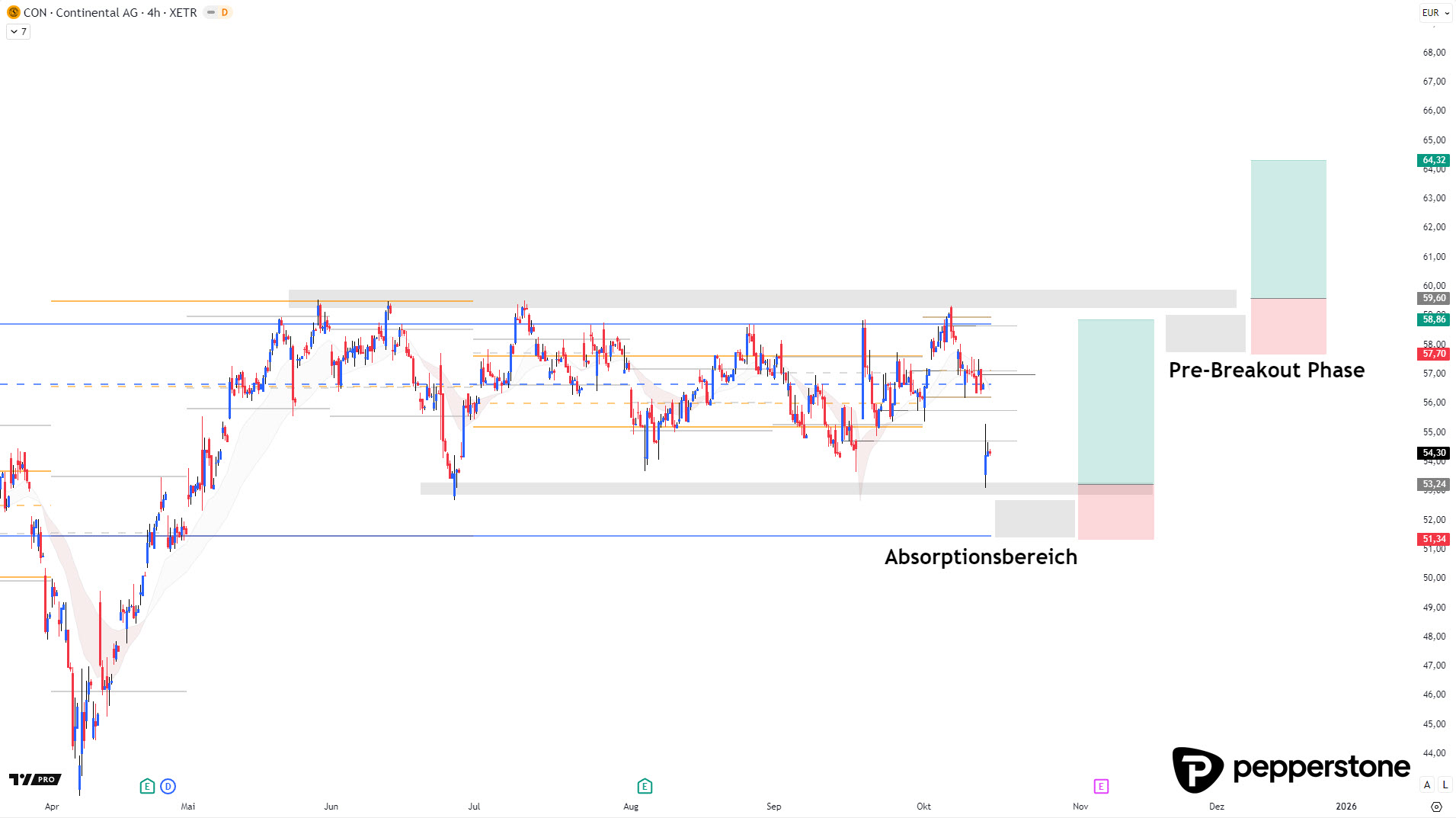 Die Aktie von Continental befindet sich in einer neutralen, aber hochspannenden Marktphase. Ein Absorptionssetup unterhalb von 52,90 € sowie ein Breakout-Setup über 60 € markieren die relevanten Handelszonen. Beide Varianten erfordern Bestätigung durch kurzfristige Price Action – blindes Handeln bleibt riskant. Das Umfeld bietet ideale Voraussetzungen für selektives, diszipliniertes Trading mit klarer Risikodefinition.