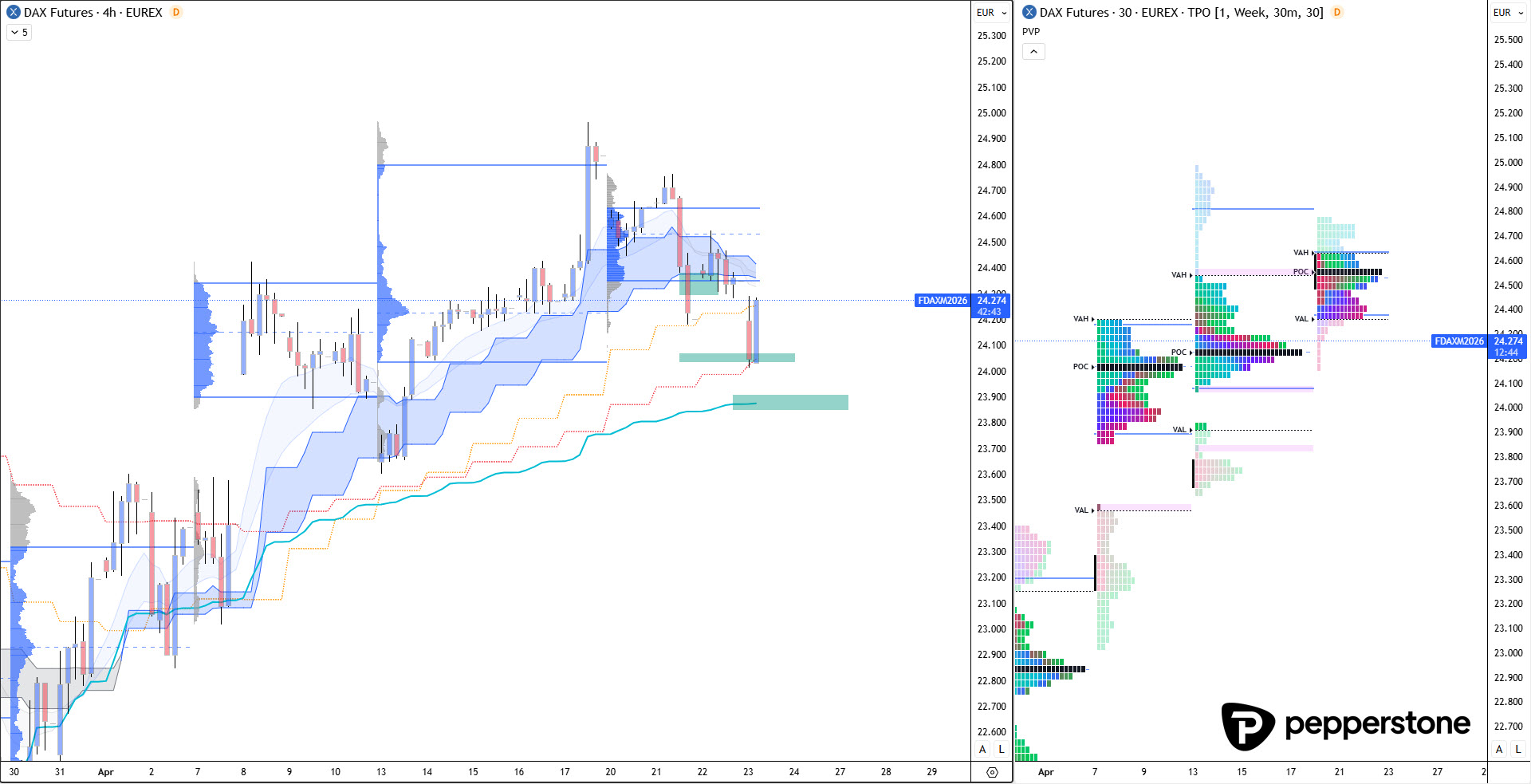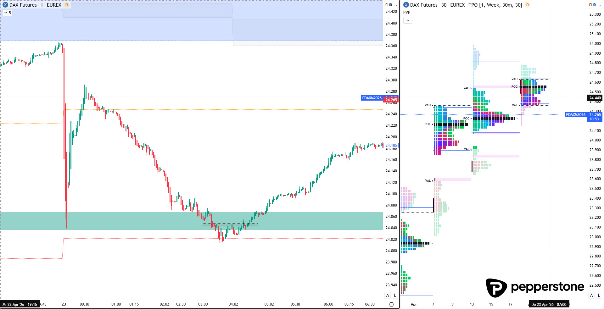 Der entscheidende Kontext war diesmal die Balance-Struktur: Die gesamte Value Area der aktuellen Woche lag innerhalb der Value Area der Vorwoche, was typischerweise einen ausbalancierten Markt beschreibt. Dadurch wird der Ausbruch aus dem Value-Bereich umso aussagekräftiger, weil der Markt in dem Moment nicht „nur“ schwankt, sondern bewusst in einen unfairen Bereich driftet. Unterhalb der Value-Area-Low der aktuellen Woche und gleichzeitig unterhalb der Value-Area-Low der Vorwoche war der DAX damit – wenn man es so formulieren will – in einem doppelt unfairen Bereich relativ zur aktuellen und zur Vorwoche. Genau deshalb war die Location so spannend, und genau deshalb wurde die zweite Station am Ende auch so sauber abgearbeitet: Der Markt musste diese Disbalance irgendwann wieder auspreisen, und der Rebound war die logische Folge.