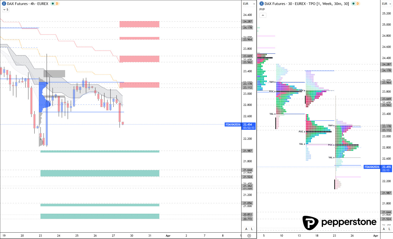 Im Nasdaq wurde heute Morgen zumindest bereits eine Unterstützung angelaufen und ein Signal konnte dort abgearbeitet werden; das ordne ich im späteren Teil der Handelsvorbereitung noch sauber ein. Für den DAX bleibt die operative Logik unverändert klar: Entweder der Rücklauf short an die VAH der Woche, oder – falls der Markt in tiefe Unterstützungscluster hinein überdehnt – ein eng geführter Long aus tiefer Verortung, jeweils nur mit Bestätigung und ohne „Zwischenzone“-Trades.