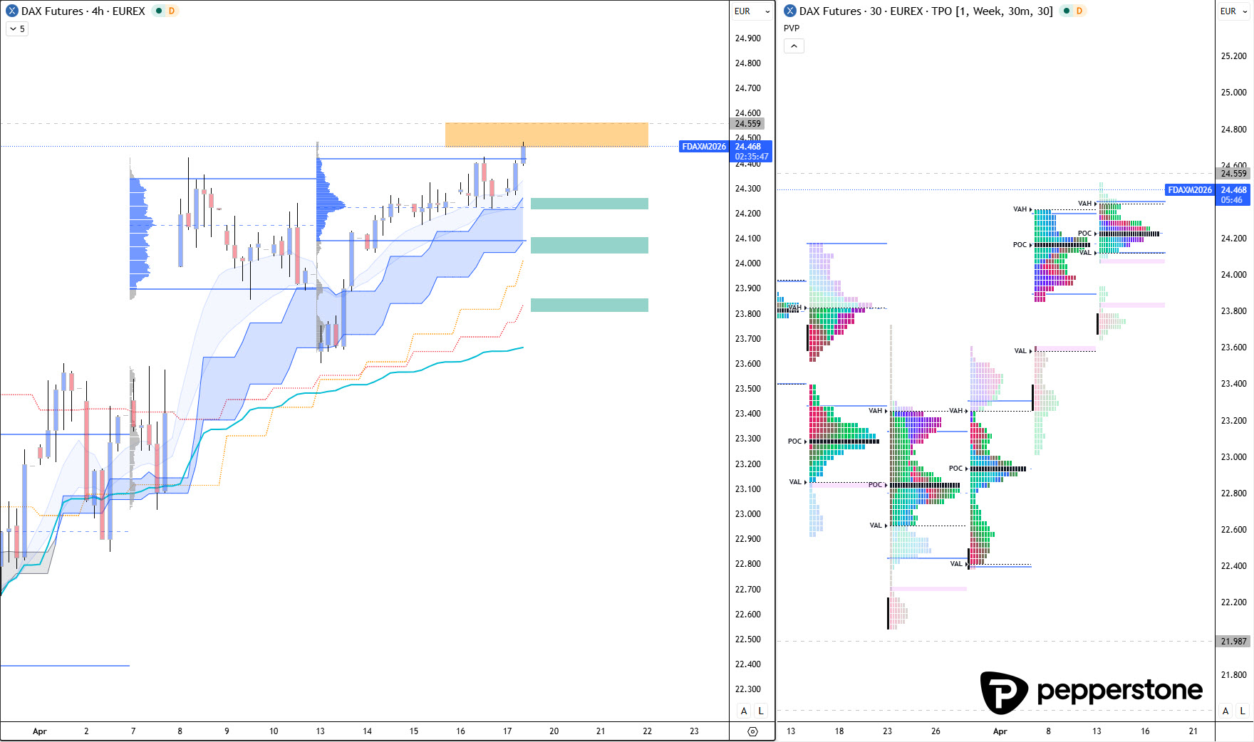 Aus meiner Sicht ist das der Moment, in dem es sinnvoller ist, auf andere Basiswerte auszuweichen, wenn man diese Option hat. Wer in einem solchen Tape unbedingt handeln will, geht häufig Kompromisse ein – und genau diese Kompromisse werden im Fall einer Korrektur teuer, weil man nicht aus günstiger Verortung handelt, sondern aus dem Impulsbereich heraus. Deshalb bleibt die Logik für den DAX klar: Unterstützungen werden erst deutlich tiefer interessant, konkret bei 24.240 (Value-Area-Low), darunter 24.080 und als nächste tiefere Staffel bei 23.850 Punkten. Erst wenn der Markt dorthin korrigiert und eine bestätigte Stabilisierung liefert, entsteht wieder ein Setup, das nicht auf Hoffnung basiert, sondern auf Verortung.