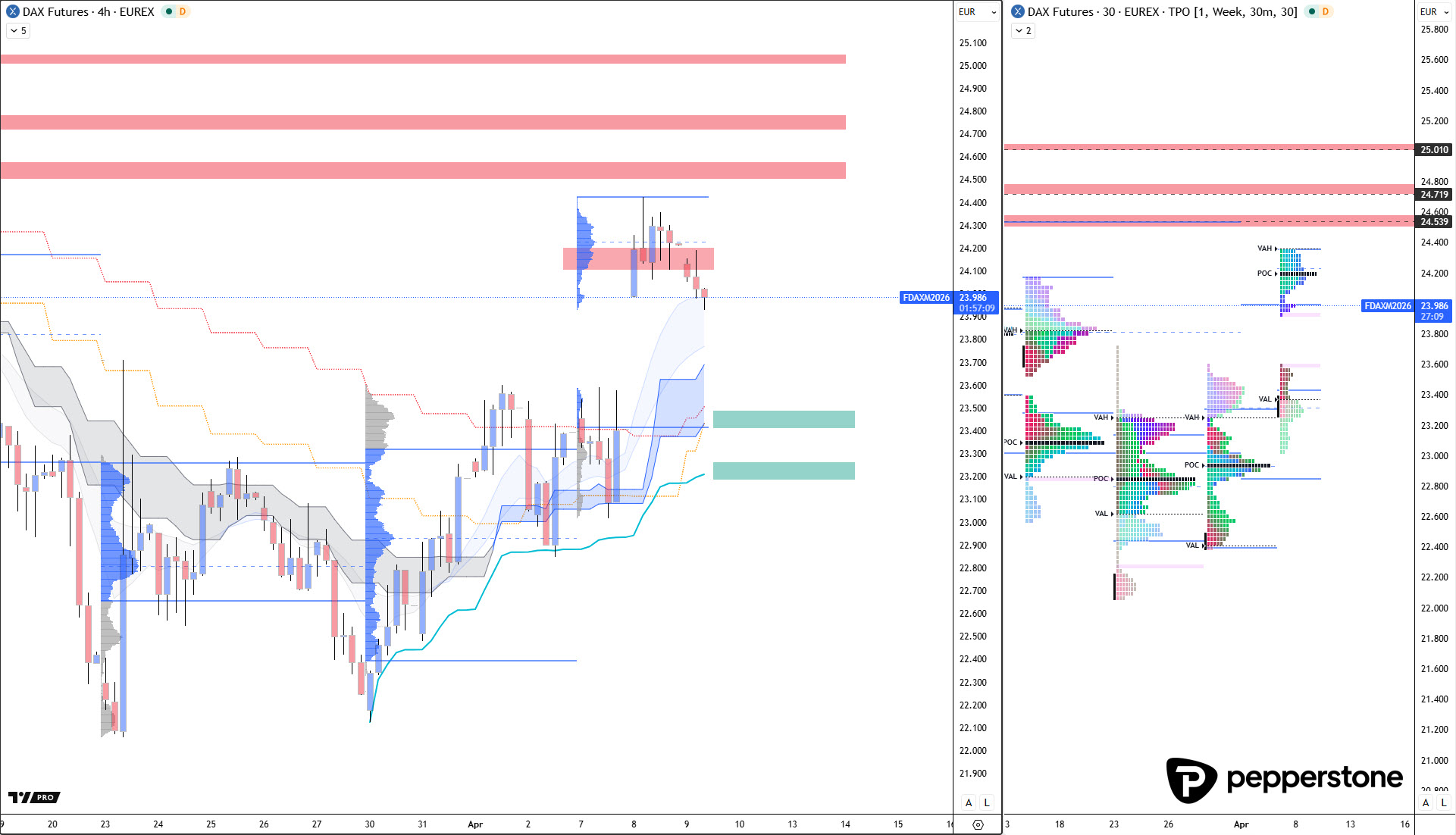 Auf der Long-Seite ist die Lage durch die vorherige Überdehnung ebenfalls unattraktiv. Neue Longpositionen lassen sich nicht „einfach so“ begründen, weil der Markt für einen antizyklischen Ansatz erst eine tiefere Korrektur liefern muss, die den Preis wieder in eine solide, asymmetrische Support-Verortung zurückführt. Für mich beginnt diese Logik frühestens bei 23.490 Punkten. Ohne diesen Rücklauf wäre ein Long eher ein Versuch, nicht ein Setup – und genau das möchte ich vermeiden.