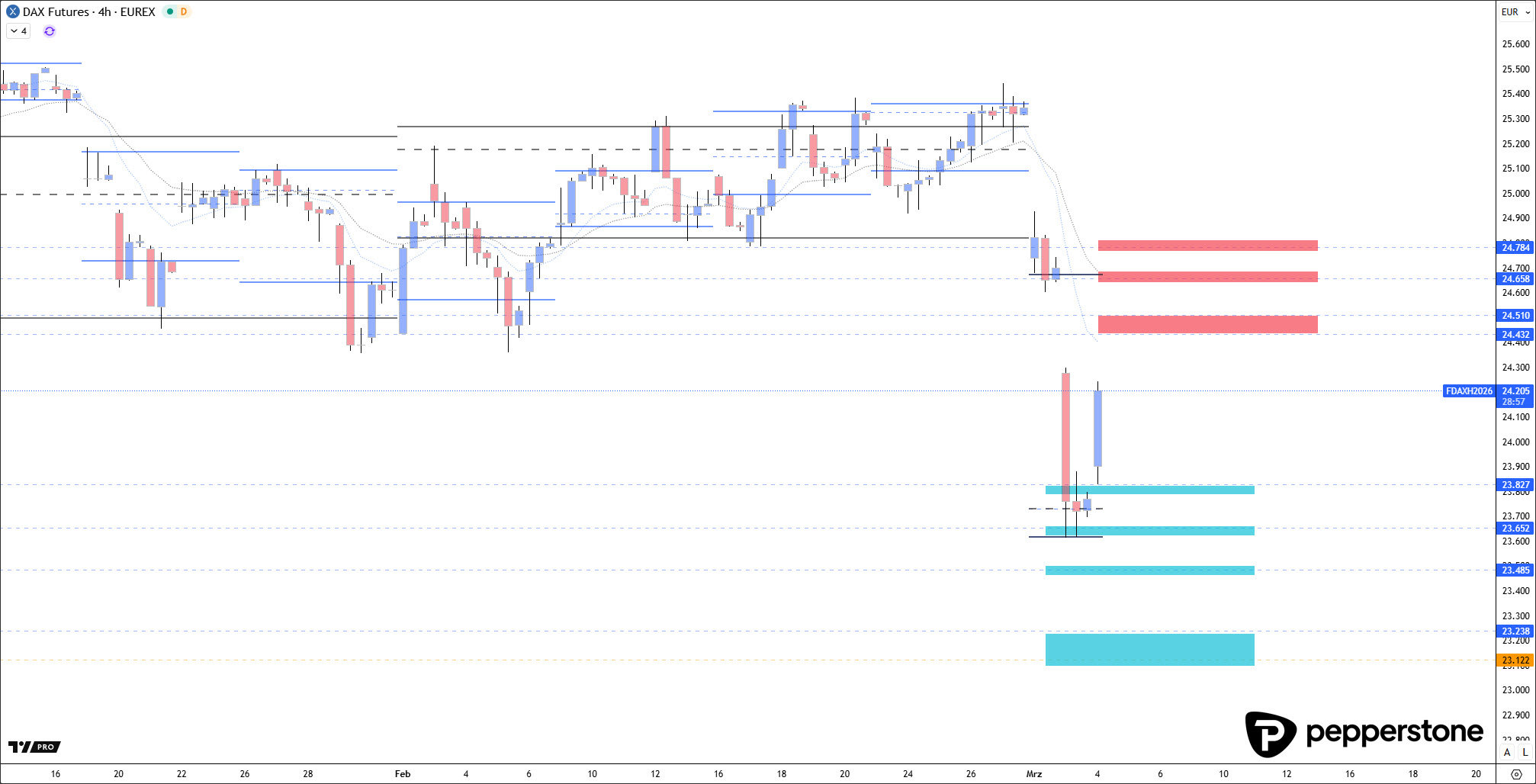 Die relevanten Short-Verortungen liegen aus heutiger Sicht erst wieder höher, konkret im Bereich von 24.380, darüber 24.600 und anschließend 24.780 Punkten. Erst dort wäre der Markt aus einer Korrektur heraus wieder „oben“ genug, um Short-Positionen sinnvoll zu verorten, idealerweise mit bestätigender Price Action. Für die heutige Perspektive bedeutet das: Vermutlich ist kein Trade mehr „drin“, es sei denn, der Markt korrigiert noch einmal höher in Richtung dieser Zonen und öffnet damit überhaupt erst ein sauberes Short-Fenster.