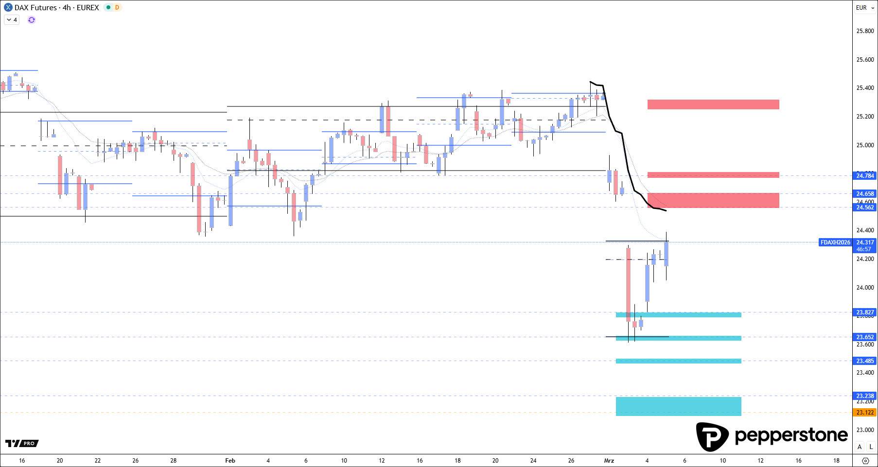 Für den heutigen Tag bin ich jedoch nur dort bereit, neue Shorts aufzubauen, wo die Erholung den Markt wieder „oben“ genug verortet. Primär ist das der Bereich der Anchored VWAP inklusive des Widerstandsclusters zwischen 24.570 und 24.650 Punkten. Dort entsteht eine saubere Reaktionszone, weil dynamischer Anker und Widerstand zusammenfallen und damit ein klarer Rahmen für Timing und Risikoführung entsteht. Darüber hinaus wird ein zweites Short-Fenster erst wieder höher interessant: an der Tages-EMA20 in Kombination mit der Value-Area-Low Februar bei 24.780 Punkten, weil dieser Bereich typischerweise als „Deckel“ einer Erholung fungieren kann, wenn das übergeordnete Momentum short bleibt.