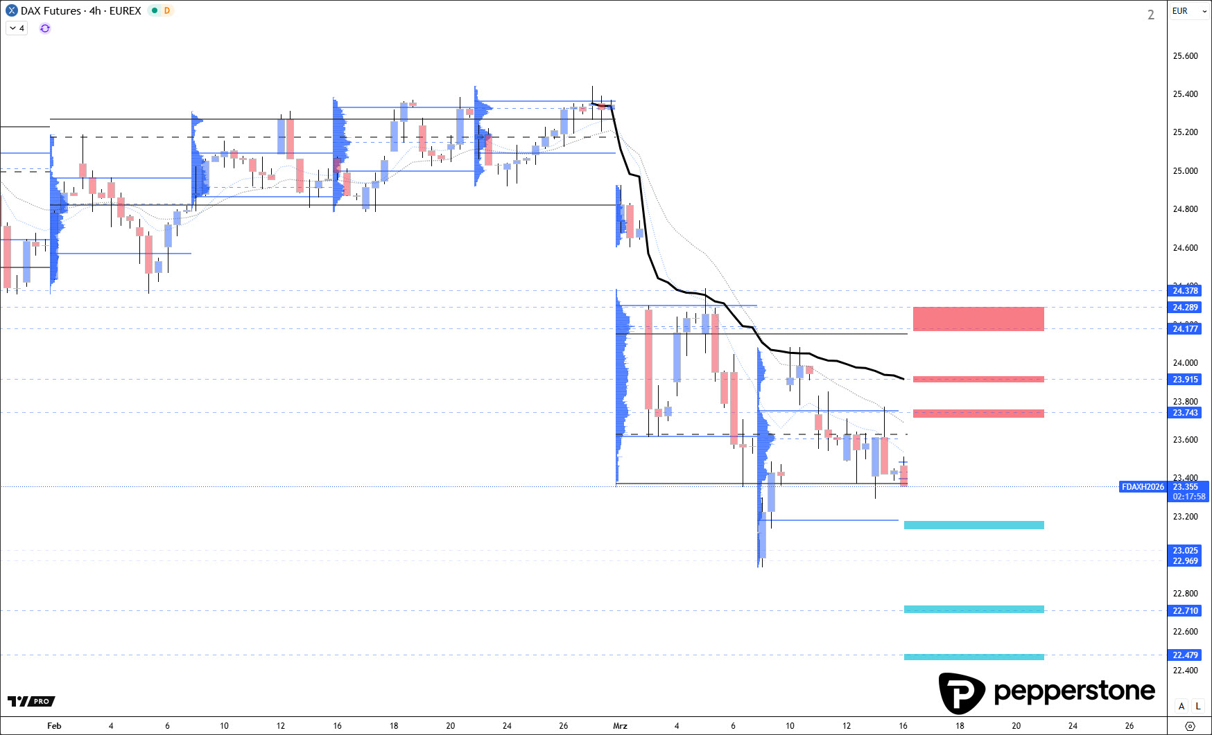Die Handelsausrichtung bleibt weiterhin abwärtsgerichtet. Ich habe alle Handelsmarken aktualisiert, und damit ist die Logik für heute klar: Long-Unterstützungen sind grundsätzlich handelbar, aber weil sie gegen die Handelsausrichtung laufen, sind sie mit einem erhöhten Risiko verbunden und benötigen umso mehr Bestätigung. Idealer ist es, aus einer Korrektur heraus in Richtung des vorherrschenden Trends zu arbeiten – also erst dann aktiv zu werden, wenn der Markt „oben“ wieder saubere Short-Verortungen anbietet oder eine echte Überdehnung eine asymmetrische Chance eröffnet.