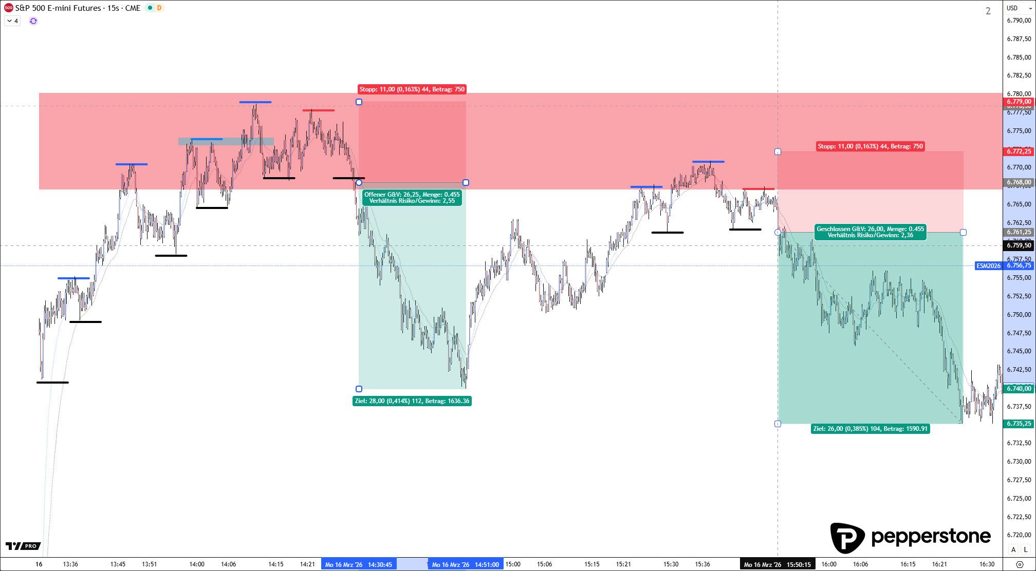 Hinzu kommt ein klarer Event-Rahmen: Der Markt wartet sehr wahrscheinlich auf die morgige Fed-Zinsentscheidung am Mittwoch um 19:00 Uhr. In solchen Phasen steigt die Wahrscheinlichkeit für abwartendes Verhalten, enge Spannen und „unfertige“ Bewegungen, weil viele Marktteilnehmer Risiko reduzieren oder Positionen nicht mehr aggressiv aufbauen. Entsprechend habe ich die Handelsmarken fachgerecht adjustiert und arbeite hier konsequent mit Alarmen, statt in einer unvorteilhaften Verortung Trades zu erzwingen.