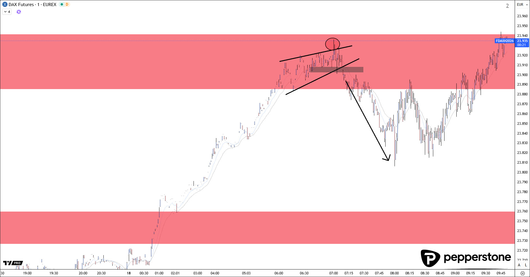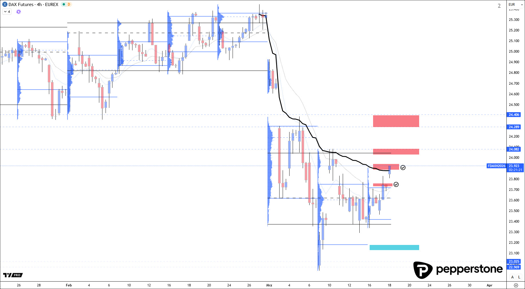 Der DAX hat bereits die ersten zwei Widerstandszonen erreicht. Gestern Abend konnte der Markt nach einer sichtbaren Trendwende knapp 50–60 Punkte abarbeiten – kein „Riesentag“, aber im Kontext durchaus handelbar. Die zweite Handelszone wurde dann heute Morgen relativ früh erreicht und lieferte mit einer Trapped-Buyers-Konstellation in Form eines bärischen Keils eine sehr saubere, gut strukturierte Short-Logik. Das war prozessual sehr zufriedenstellend, auch wenn ich nachvollziehen kann, dass es für viele nebenberuflich aufgrund der Uhrzeit schwer umsetzbar war. Solche Situationen gehören dazu – sie sind nicht „ärgerlich“, sondern zeigen schlicht, dass Märkte nicht auf unsere Zeitpläne warten.