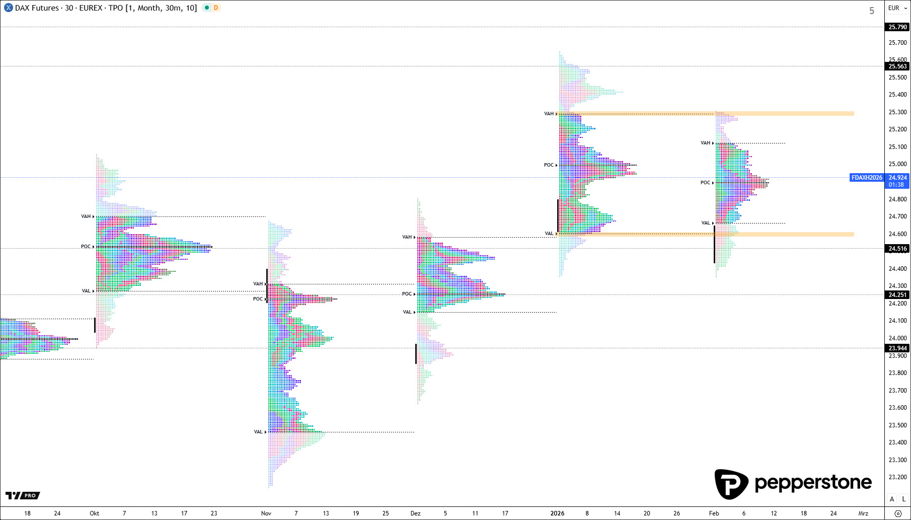 Der TPO-Chart die Seitwärtstendenz sehr klar: Der Markt hängt exakt an der Grenzlinie zwischen Value-Area-Low und Value-Area-High Januar. Solange wir dort festkleben, bleibt das Setup weniger Trend und mehr Geduldsspiel – mit einem asymmetrisch erhöhten Abwärtsrisiko, weil das „Verschachteln“ im Zweifel eher Liquidität aufbaut als Richtung. Ich will deshalb erst sehen, dass der Markt entweder sauber in tragende Unterstützungscluster hineinläuft (für Longs) oder dass die Struktur offensichtlicher kippt, bevor ich progressiver werde. Bis dahin ist Disziplin der klare Vorteil, nicht Aktivität.