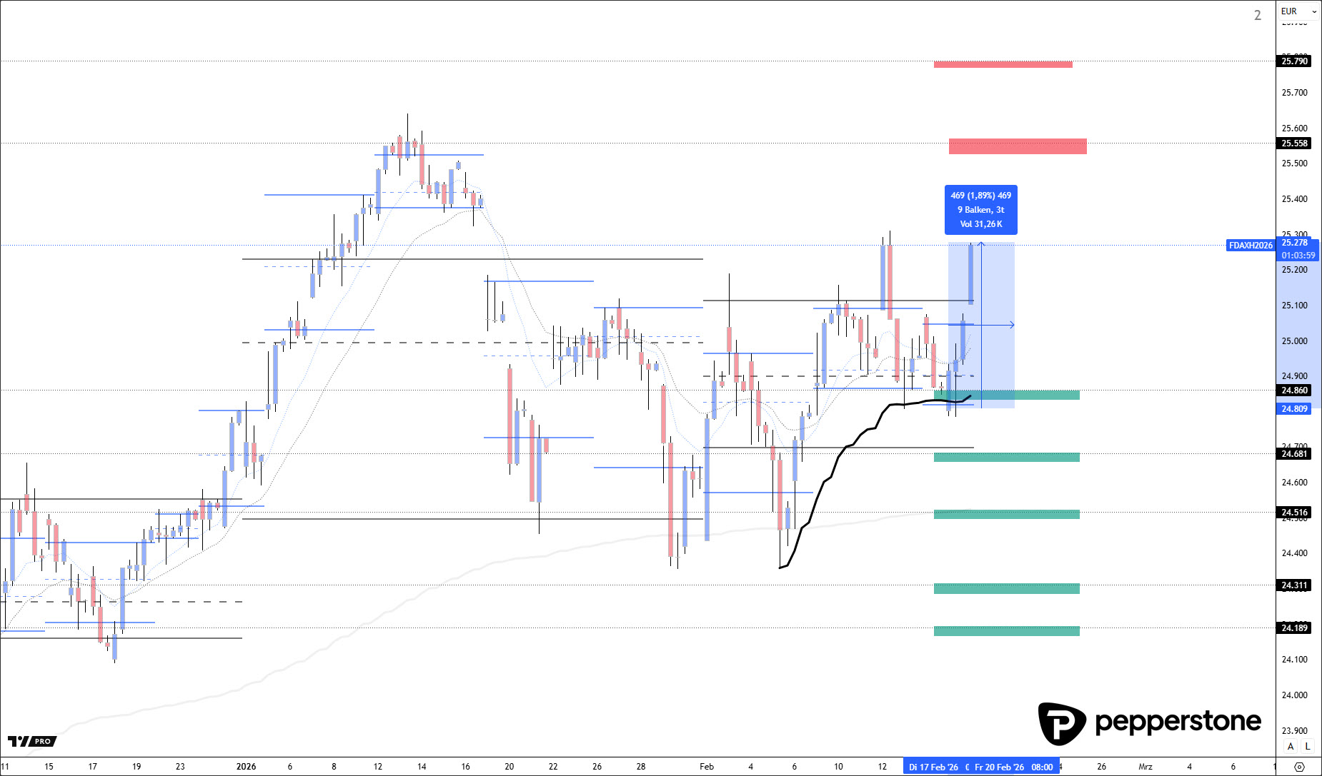 DAX Aktuell und Prognose: Der FDAX hat seine erste Handelszone wie geplant erreicht: die Value-Area-Low der Vorwoche bei 24.860 Punkten. Genau dort lag zusätzlich die Anchored VWAP aus dem Februar-Tief – ein sauberes, institutionelles Support-Cluster, das den Rücklauf nicht nur „abfedert“, sondern strukturell legitimiert. In einer verschachtelten Marktphase ist das der entscheidende Unterschied: Nicht jede Unterstützung ist gleichwertig, aber wenn Volumenstruktur und Anchored VWAP zusammenfallen, entsteht ein Level, an dem ich Reaktion erwarte statt Hoffnung trade.