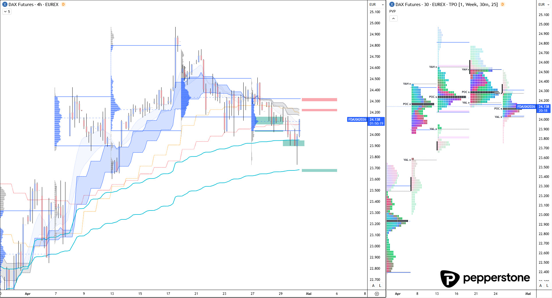 DAX Aktuell und Prognose: Der DAX hat mit dem Erreichen der Anchored VWAP – also dem volumengewichteten Durchschnitt – bei 23.950 Punkten alle drei Unterstützungen dieser Woche erfolgreich abgearbeitet. An jeder dieser Supports konnte der Markt in der Folge um etwa 150 Punkte reagieren, was auf H4-Ebene oft kleiner wirkt, als es intraday tatsächlich war. Genau deshalb ist die Zonenarbeit so wertvoll: Die Reaktionen sind nicht „unsichtbar“, sie sind nur kompakter – und dennoch planbar, sauber und mehrfach verwertbar, wenn man sie im richtigen Zeitfenster liest.