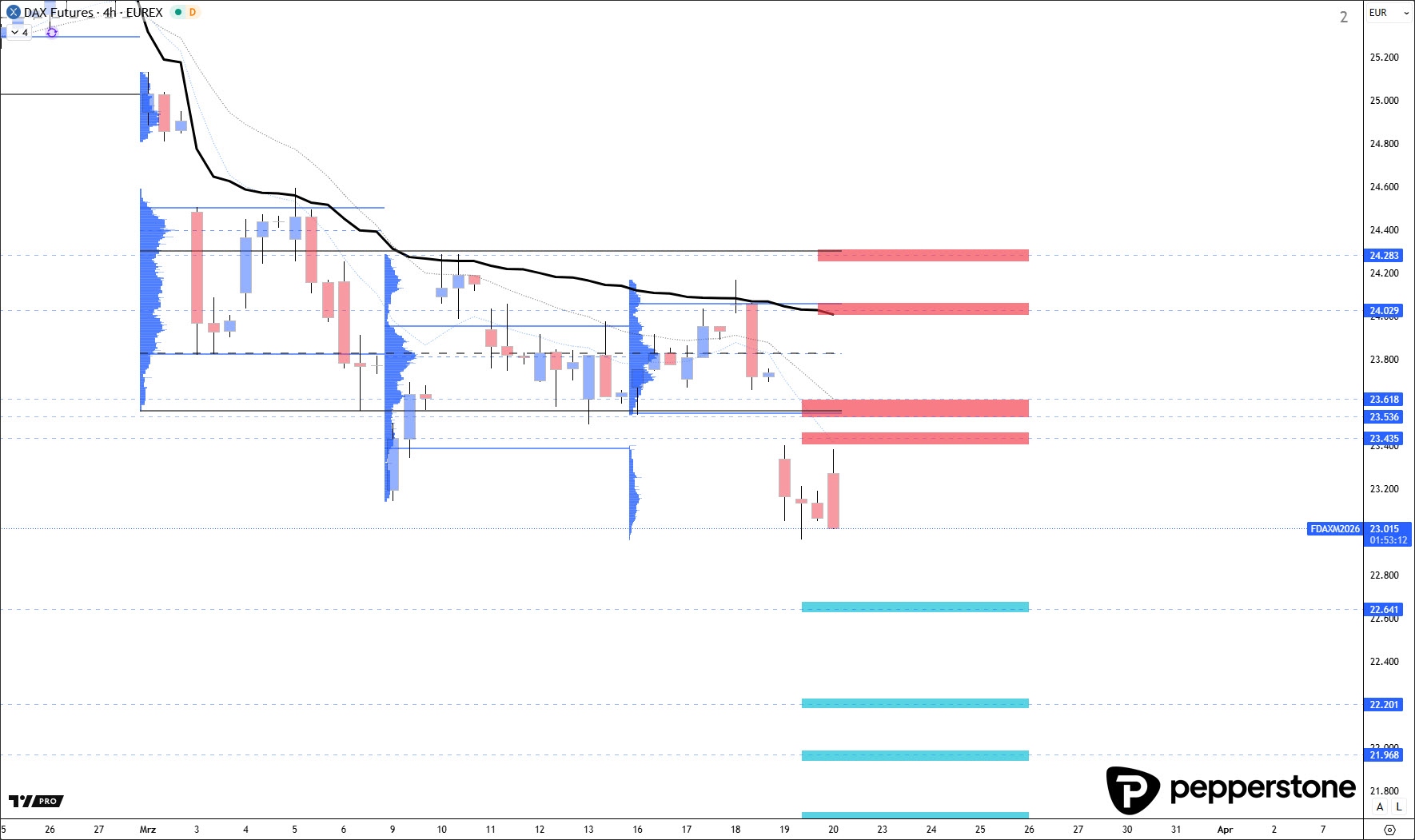DAX Aktuell und Prognose: Die Handelsausrichtung im DAX bleibt weiterhin klar abwärtsgerichtet. Entsprechend sind mögliche Kaufpositionen aktuell bewusst weit von den gegenwärtigen Kursen entfernt, weil ein Long gegen die Handelsausrichtung nur dann ein sauberes Chancen-Risiko-Profil bekommt, wenn der Markt in eine echte, extreme Überdehnung hineinläuft und dabei an sehr starke Unterstützungen aus Volumen- bzw. TPO-Zonen kommt. Genau deshalb sind diese Long-Unterstützungen so eingezeichnet, wie sie eingezeichnet sind: nicht „damit man etwas hat“, sondern damit die Verortung wirklich asymmetrisch wird und man gegen den Trend überhaupt argumentieren kann.