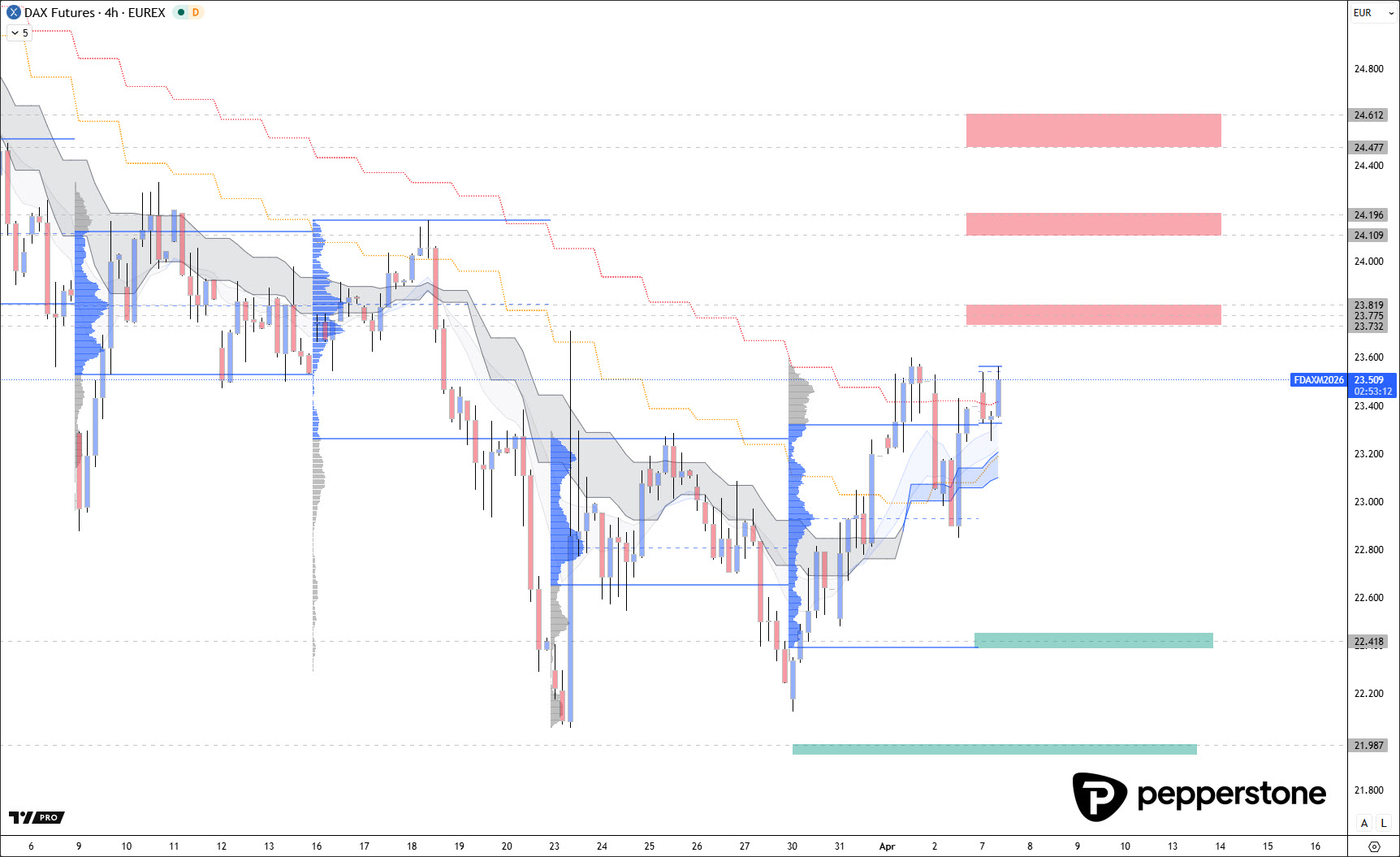 DAX Aktuell und Prognose: Nach dem verlängerten Osterwochenende starten wir mit dem DAX in die neue Handelswoche, während die US-Märkte am Montag bereits einen regulären Handelstag hatten. Der DAX befindet sich dabei strategisch in einer etwas heiklen Zone: Einerseits notiert er knapp oberhalb der Value-Area-High der Vorwoche und baut damit langsam ein leichtes Long-Momentum auf. Andererseits reicht ein moderater Rückzug, um den Index wieder in die Value Area der Vorwoche zurückfallen zu lassen – und genau dieses „oberhalb/innerhalb“-Spannungsfeld macht Setups nahe am aktuellen Kurs unattraktiver, weil die Verortung schnell kippen kann.