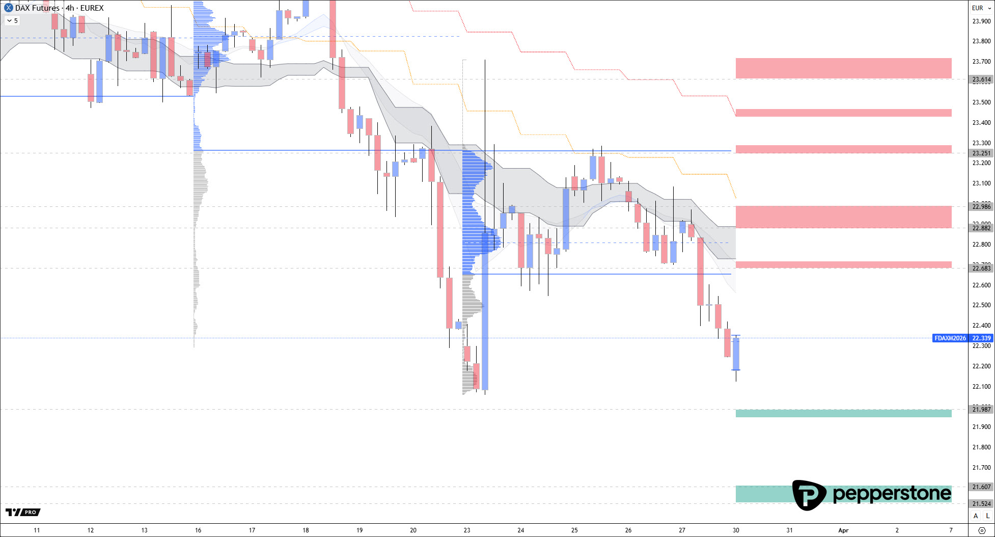 Im DAX bleibt das Momentum abwärtsgerichtet und der Markt wirkt insgesamt schwach, auch wenn sich zu Wochenbeginn eine leichte Erholung zeigt. Für prozyklische Trades in Richtung der Handelsausrichtung werden Rückläufe in definierte Widerstandsbereiche entscheidend, weil dort das Chancen-Risiko-Profil wieder sauber wird. Interessante Zonen aus einer Korrektur heraus liegen bei 22.690, im Cluster 22.870–22.980 sowie an der Value-Area-High der Vorwoche bei rund 23.248 Punkten. Erst wenn der Markt in diese Bereiche hineinläuft und dort eine bestätigte Reaktion liefert, entsteht ein Setup, das nicht „erzwungen“ wirkt.