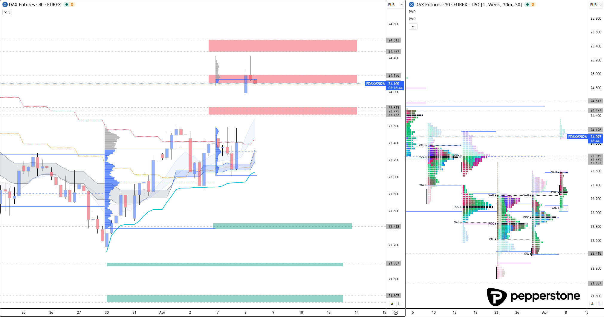 Der Markt ist nach diesem Move klar überdehnt, deshalb bleibe ich heute konsequent auf der Short-Seite. Idealerweise liefert der DAX noch eine weitere, deutlich höhere Verortung für einen besseren Reaktions-Short. Besonders interessant wäre ein Lauf an die Value-Area-High des Vormonats – im Future liegt diese Zone bei 24.520 Punkten. Ich definiere das bewusst als Bereich und nicht tickgenau, also als Zone 24.470 bis 24.550, damit die Verortung handelbar bleibt, auch wenn der Markt „durchschießt“. Sollte der DAX erneut in diesen Bereich laufen, wäre dort eine weitere Short-Möglichkeit gegeben, selbstverständlich nur bei klarer untergeordneter Bestätigung.