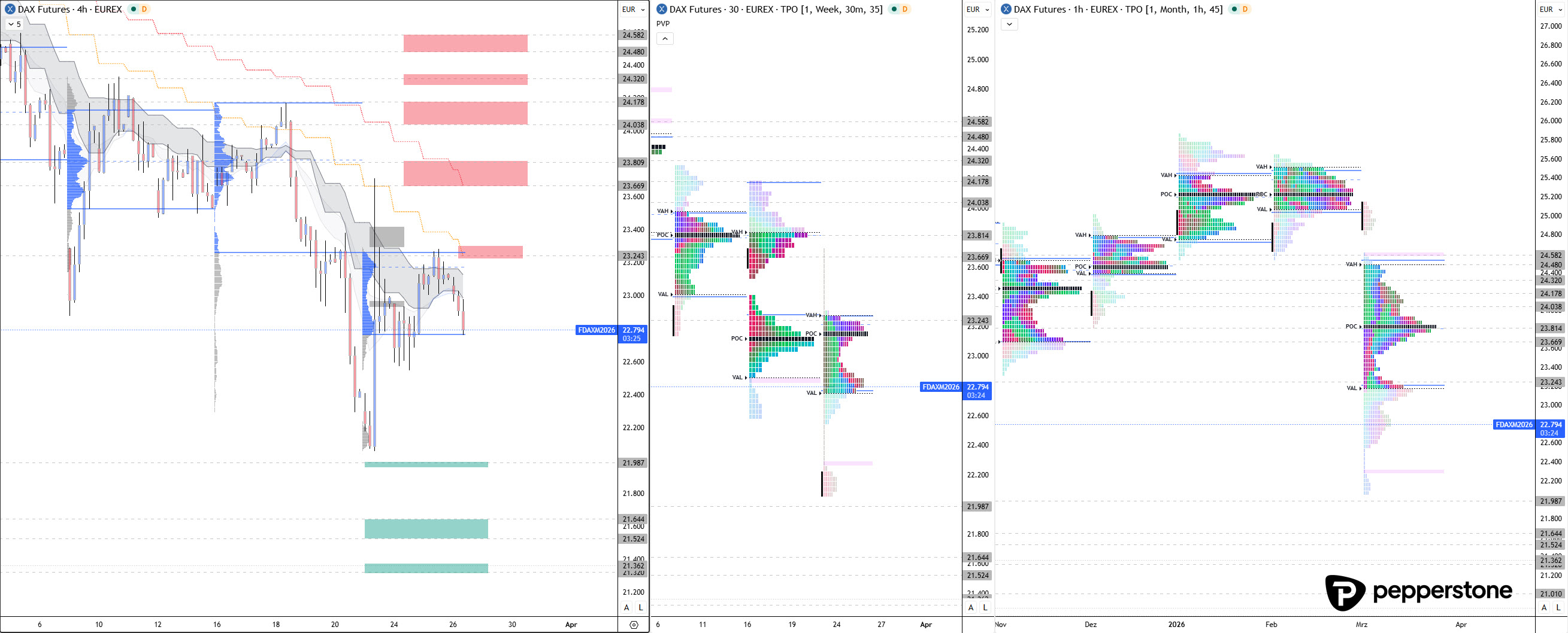 DAX Aktuell und Prognose: Der DAX bleibt weiterhin seitwärts geprägt und wird im Kern zwischen der Value-Area-High und der Value-Area-Low auf Wochenbasis hin- und hergeschoben. Die Handelsausrichtung bleibt dabei trotzdem short, wodurch sich ein typisches Spannungsfeld ergibt: Der Bias ist abwärts, aber der Markt liefert kaum Anschlussdynamik und verharrt in einer abwartenden Struktur. Die extrem niedrige Volatilität wirkt dabei wie ein stilles Signal: Der Markt zeigt, dass die Erwartung an einen angekündigten „Deal“ im Iran-Konflikt inzwischen eingepreist ist und nun Substanz geliefert werden muss – sonst bleibt es bei zähen Spannen statt klaren Impulsen. Dass viele Einzelaktien ebenfalls vorsichtig agieren, passt exakt in dieses Bild und spiegelt sich damit auch im Indexverhalten wider.