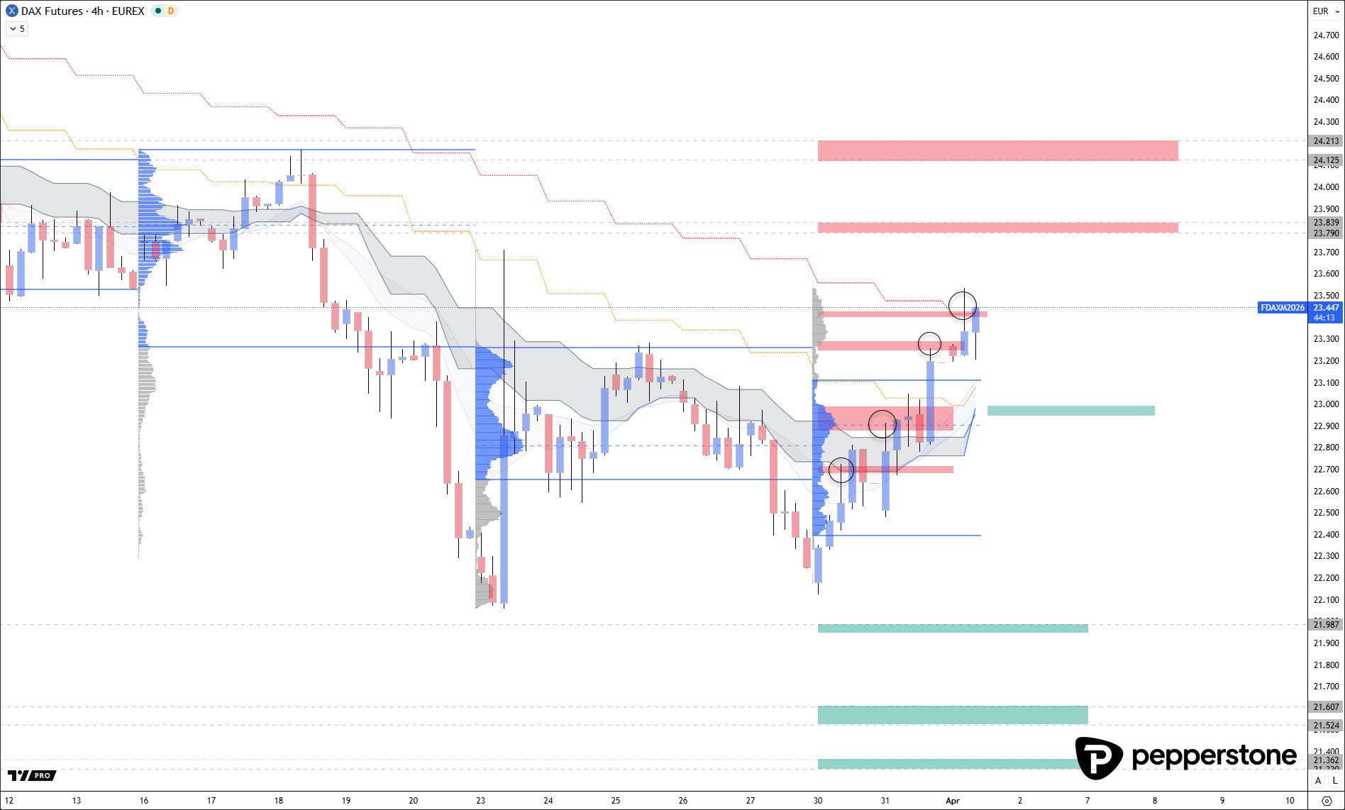 Mit dem heutigen Lauf sind mehrere Widerstände bereits abgearbeitet, und genau das ist für die weitere Planung wichtig: Erstkontakt-Vorteile sind in Teilen genutzt, der Fokus verschiebt sich auf die nächsten, noch offenen Cluster. Auf der Oberseite bleibt ein stärkerer Widerstandsbereich bei rund 23.840 Punkten relevant, der als nächster „Deckel“ fungieren kann, falls der Markt nochmals korrigiert. Parallel ist eine neue Unterstützung hinzugekommen, die aktuell bei rund 23.000 Punkten mitläuft und als Strukturanker für die Unterseite dient, solange der Markt nicht wieder impulsiv durchschlägt.