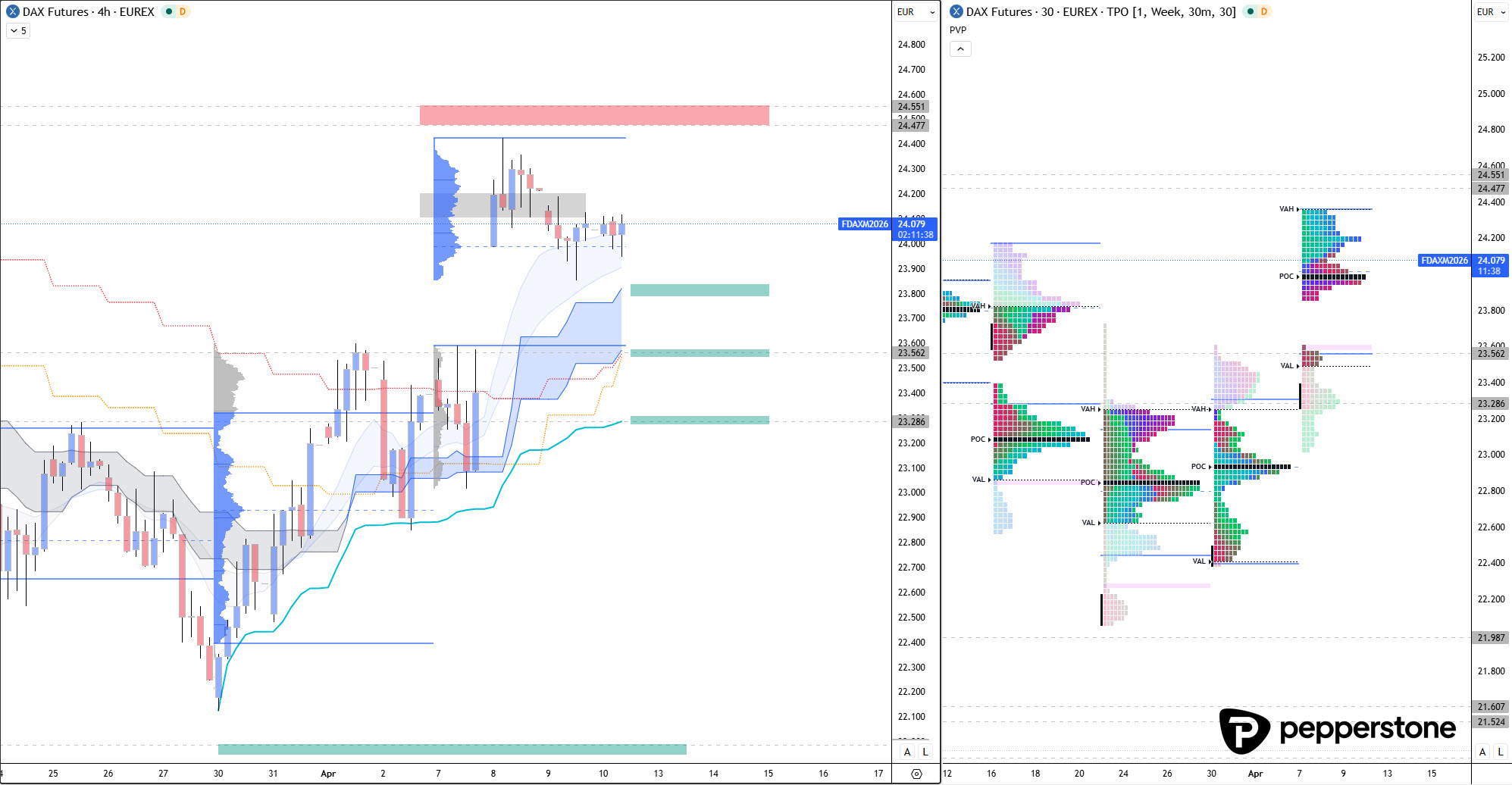 Idealerweise entsteht daraus ein tiefer Einstieg unterhalb der aktuellen Value-Area-Low – im ersten grün markierten Bereich bei 23.570 Punkten oder, im stärkeren Rücklauf, bei 23.300 Punkten. Ob der Markt diese Tiefe anbietet, hängt aus meiner Sicht stark davon ab, ob vor dem Wochenende nochmals Volatilität aufkommt oder ob der Markt weiter „verwaltet“ wird. Die ATR-Bänder (links unten) zeigen zumindest, dass der Markt aktuell etwas überdehnter ist und eine Korrektur grundsätzlich Raum hat – die Frage ist nur, ob sie flach bleibt oder wirklich in die günstigeren Verortungen hineinführt.