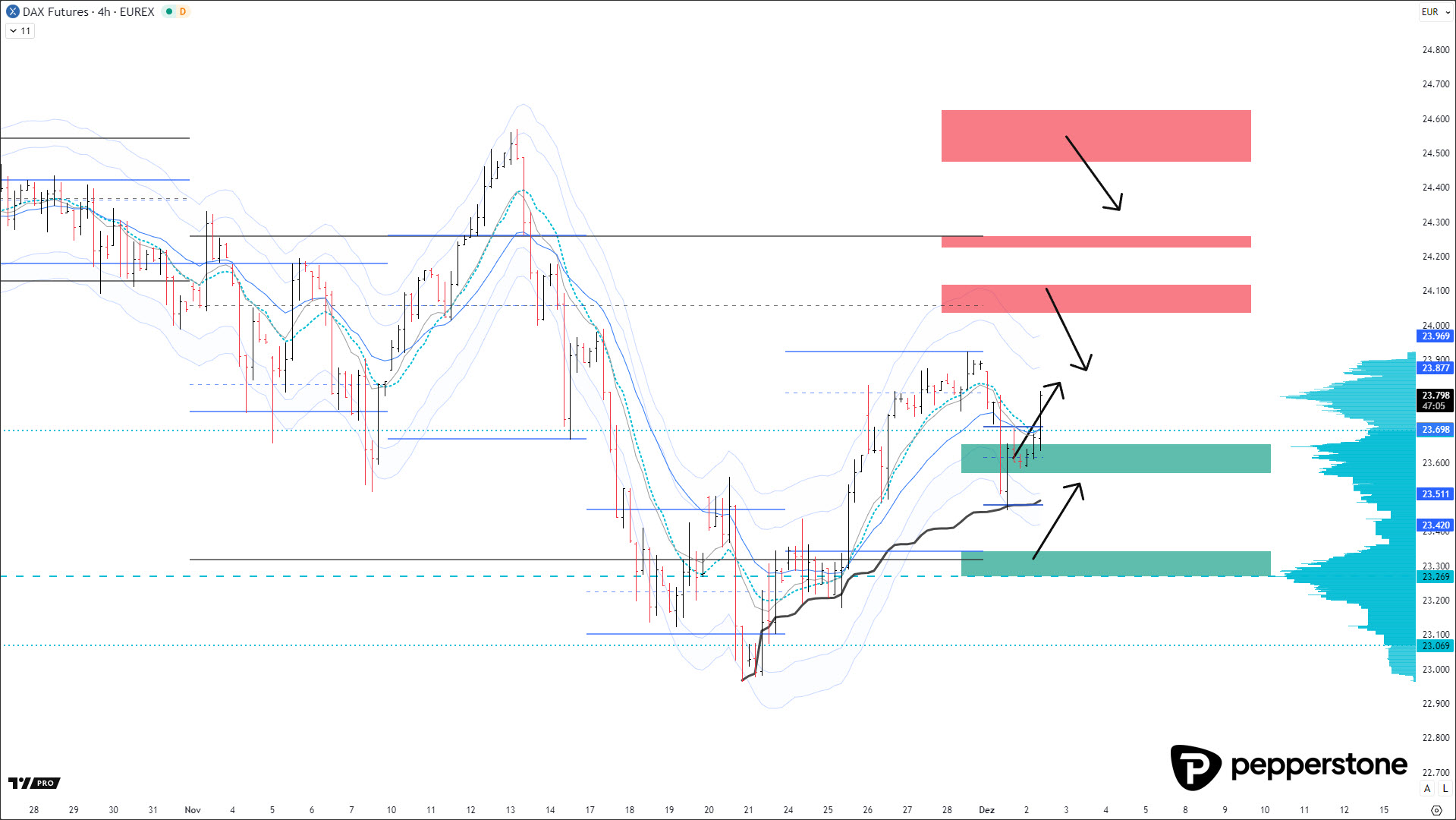DAX PROGNOSE: Der DAX verhielt sich wie erwartet korrektiv und lief präzise in die Unterstützungszone um 23.600 Punkte hinein. Kurzzeitig überdehnte der Index bis zur Anchored VWAP bei rund 23.480 Punkten, wo ich eine gesplittete Long-Position einging und diese noch am selben Tag wieder schloss. Der anschließende Impuls setzte sich auch am Folgetag fort, womit das Long-Setup technisch sauber abgearbeitet wurde. Auf der Unterseite bleibt nun der Bereich zwischen 23.340 und 23.260 Punkten relevant – dort treffen eine High-Volume-Note und die Value Area Low des Monatsprofils zusammen und bilden eine starke Unterstützungszone. Sollte der Markt diesen Bereich heute nicht erreichen, was angesichts der nötigen Abwärtsdynamik von über zwei Prozent unwahrscheinlich ist, rücken die Widerstände auf der Oberseite in den Fokus. Diese liegen bei 24.060, 24.240 sowie zwischen 24.470 und 24.600 Punkten. Da das Momentum aktuell aufwärtsgerichtet ist, sollten diese Zonen ausschließlich nach bestätigter Reaktion gehandelt werden.