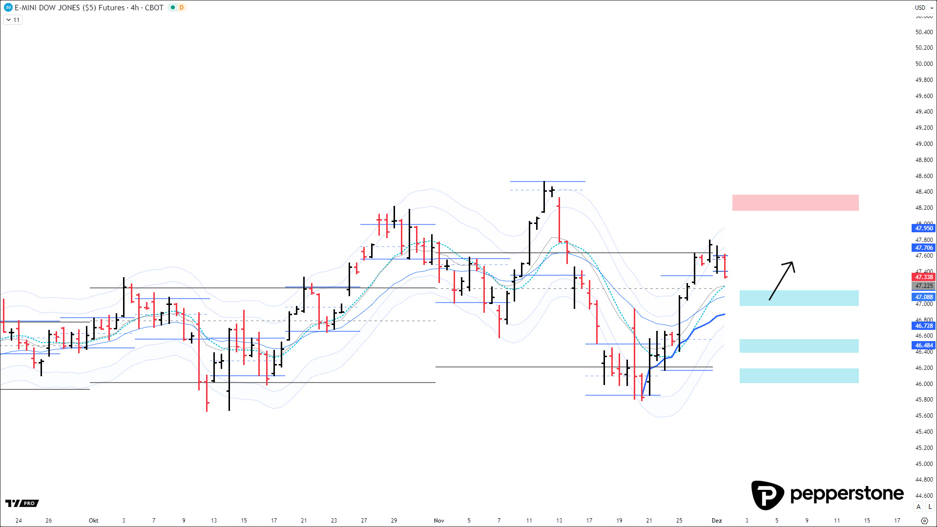 DOW JONES PROGNOSE: Der Dow Jones zeigte sich wie erwartet volatilitätsarm und wurde im Bereich der Value Area High des Vormonats – also des November-Profils – technisch sauber abgefangen. In dieser Zone ließ das Momentum spürbar nach, ohne dass sich die übergeordnete Aufwärtsstruktur verändert hätte. Die Handelsausrichtung bleibt klar steigend, weshalb vor allem Rückläufe an markante Durchschnittslinien von Interesse sind. Das strategische Vorgehen bleibt damit unverändert: Long-Setups aus Rückläufen heraus handeln. Auf der Oberseite liegt aktuell nur ein nennenswerter Widerstand im Bereich zwischen 48.170 und 48.340 Punkten. Dieser sollte jedoch ausschließlich bei klarer Bestätigung gehandelt werden, da ein voreiliger Einstieg hier leicht in ein „steigendes Messer“ übergehen könnte.