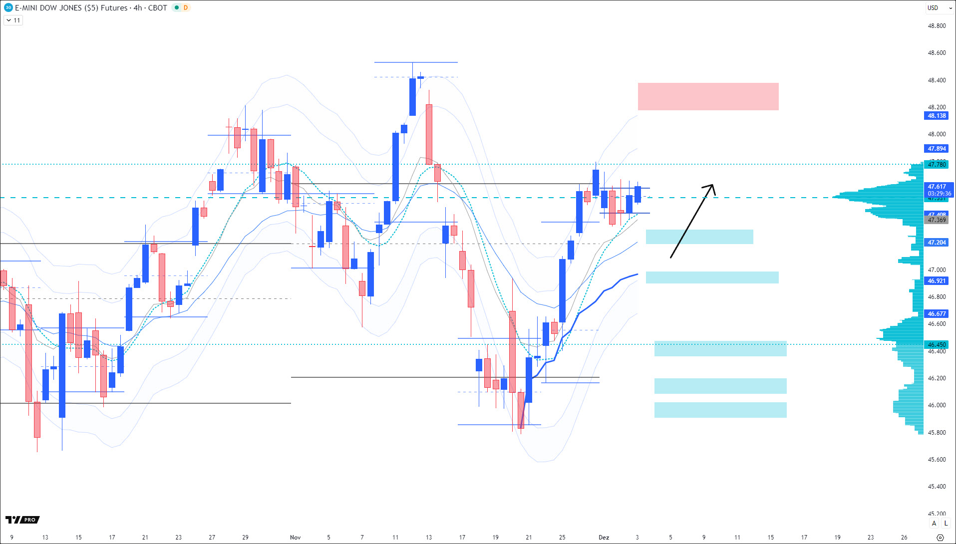 DOW JONES PROGNOSE: Während die US-Indizes insgesamt weiterhin bullisch, aber weitgehend seitwärts tendieren, konnte lediglich der Nasdaq seinen Widerstand antesten und eine moderate Reaktion zeigen. Diese Zone gilt damit als abgearbeitet und verliert an Bedeutung. Im Fokus steht nun, dass Widerstände vor allem dann gehandelt werden sollten, wenn sie im überdehnten Zustand angelaufen werden – oder alternativ Unterstützungen, sobald der Markt in eine saubere Korrektur übergeht. Beide Ansätze bleiben taktisch sinnvoll und risikokontrolliert umsetzbar.